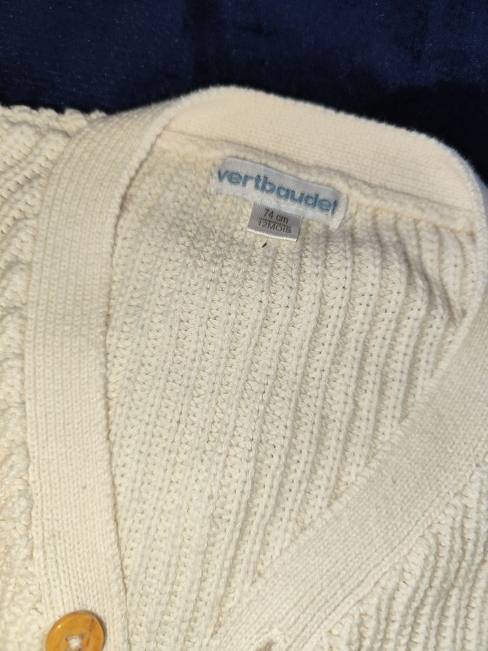 Gilet / pull / veste Verbaudet 12 mois En très bon état Vêtement porté mais pas de trou ou autre défaut. Nos vêtements sont stockés dans des boîtes en plastique. Je peux donc les laver avant envoi si vous le souhaitez.
