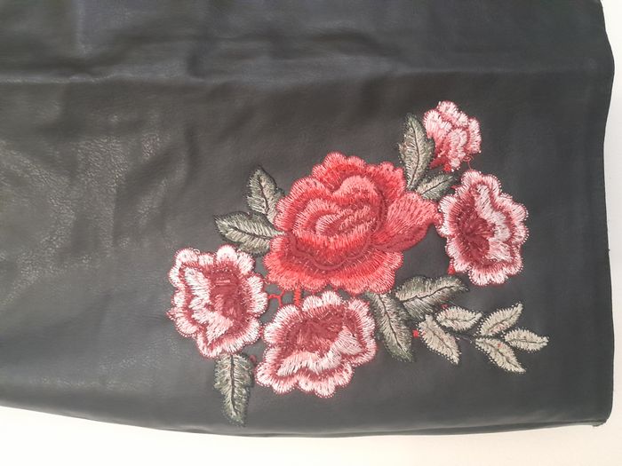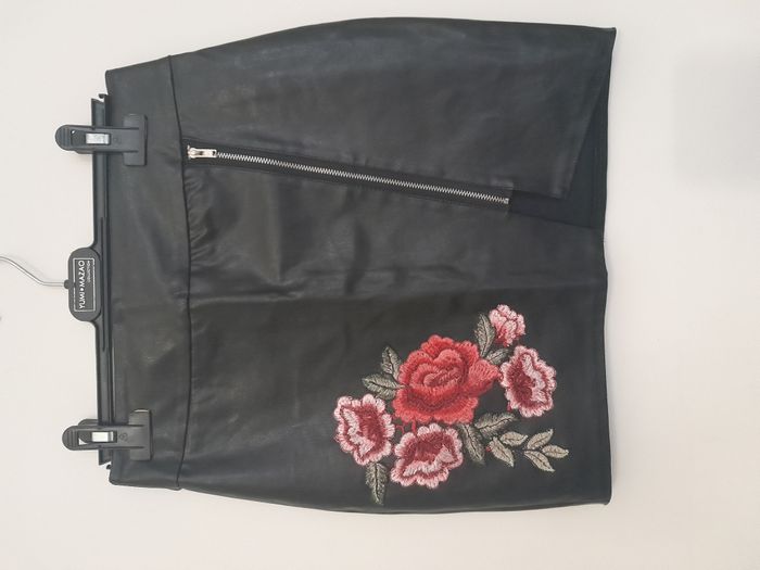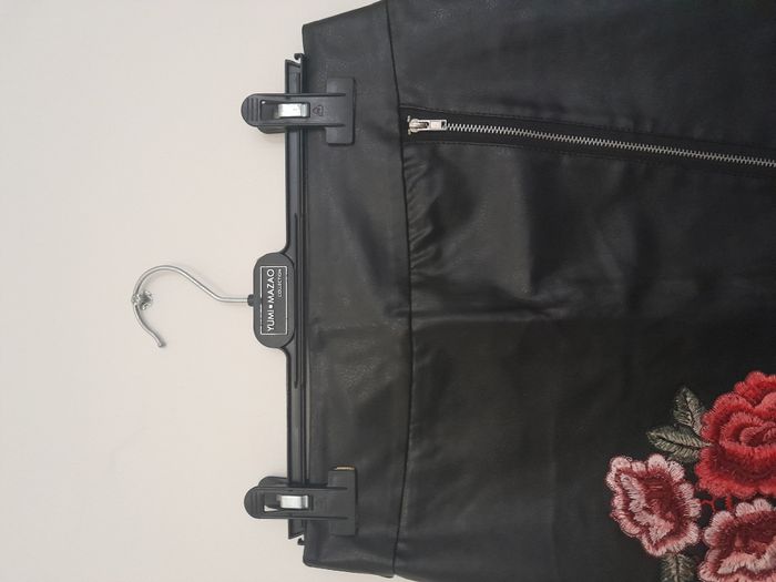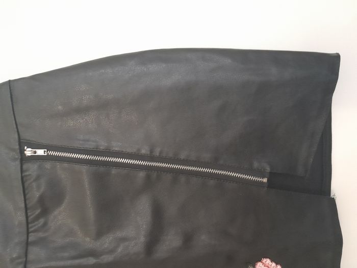 Jupe, simili cuir, broderie sur le devant, asymétrique, attache fermeture éclair au dos Longueur : 39cm, Fermeture éclair : 22cm Taille en cm : 34 Matière : 100 % Polyester Marque : Lanshifei