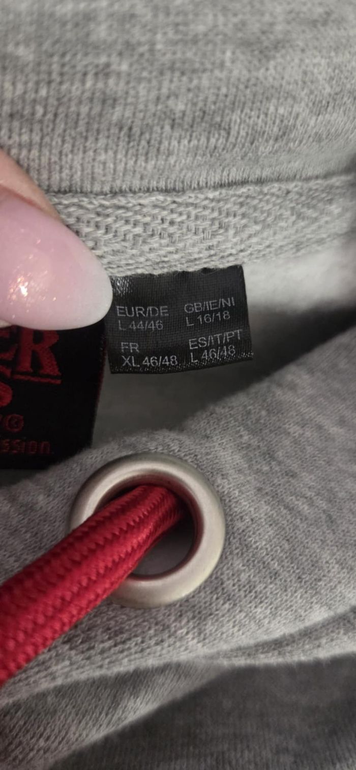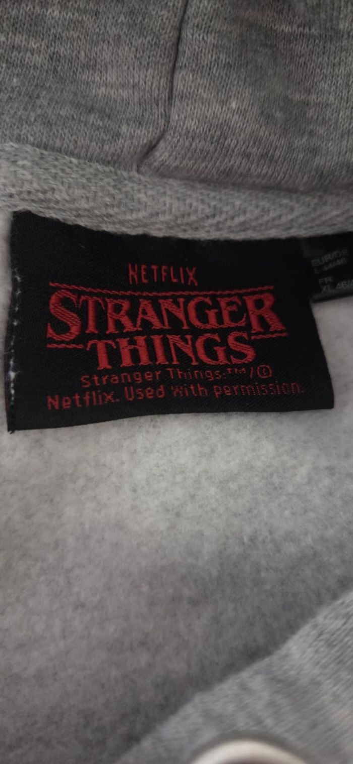 📌 Informations essentielles Marque : Netflix – Stranger Things (licence officielle) Taille : XL (FR 46/48) Coupe : Oversize / ample Longueur : 67 cm Largeur sous bras : 67 à 75 cm (matière légèrement extensible) Matière : 60 % coton – 40 % polyester État : Excellent état Couleur : Gris chiné avec imprimé Hellfire Club Envoi : Rapide et soigné 🧥 Description Superbe sweat à capuche Hellfire Club – Stranger Things, modèle officiel Netflix 🔥 Ultra tendance avec son grand visuel démon, épées et logo iconique, il est parfait pour les fans de la série ou pour un look streetwear assumé. ✔ Matière confortable et douce (intérieur molletonné) ✔ Coupe oversize très actuelle ✔ Capuche avec cordons rouges contrastants ✔ Logo Stranger Things au dos ✔ Idéal mi-saison / hiver Le sweat est en excellent état, aucune tache ni défaut.
