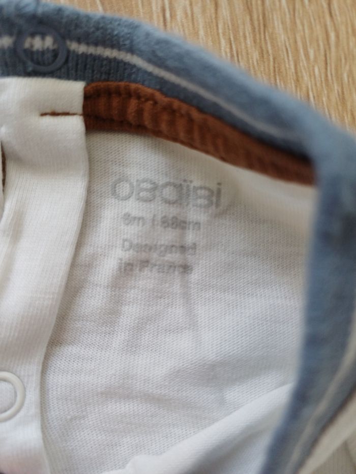Tee-shirt à manches longues blanc avec motif pour bébé garçon, taille 6 mois. Fermeture avec bouton pression à l'arrière. Bon état Marque: Obaïbi