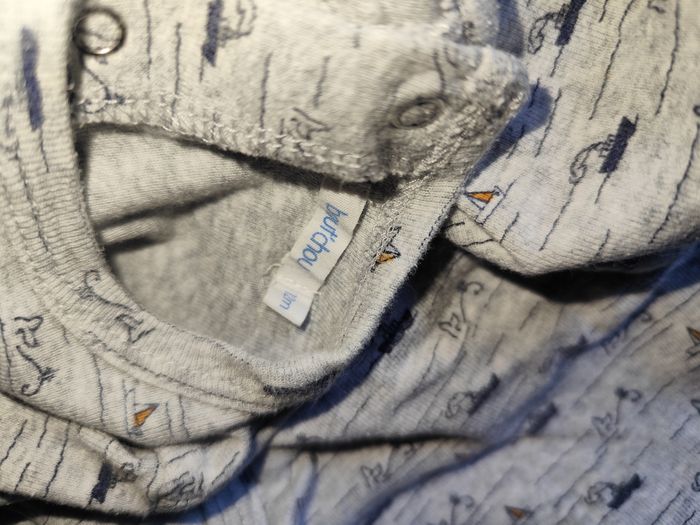 Pyjama coton bout'chou 12 mois En bon état Vêtement porté mais pas de trou ou autre défaut. Nos vêtements sont stockés dans des boîtes en plastique. Je peux donc les laver avant envoi si vous le souhaitez.