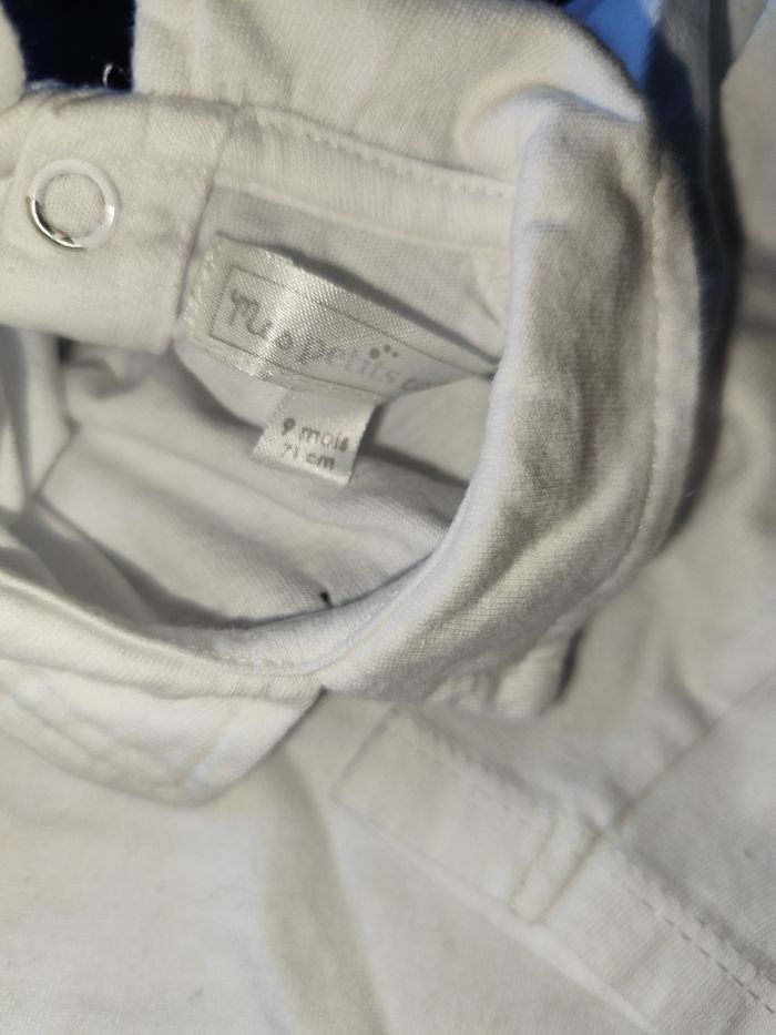 T shirt manches longues, pull fin avec faux noeud papillon mes petits cailloux 9 mois En très bon état Vêtement porté mais pas de trou ou autre défaut. Nos vêtements sont stockés dans des boîtes en plastique. Je peux donc les laver avant envoi si vous le souhaitez.