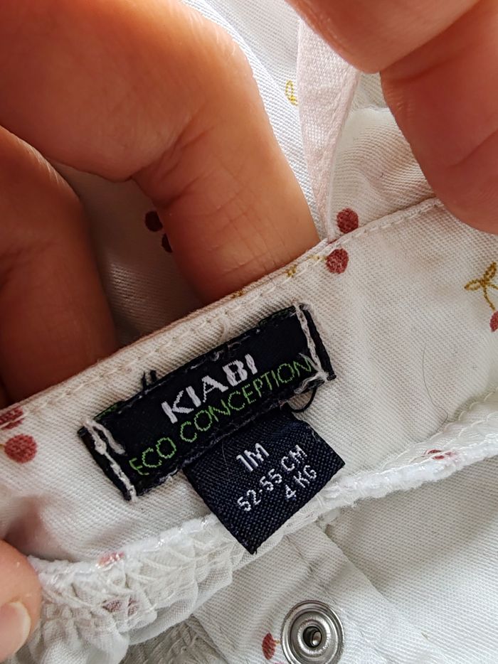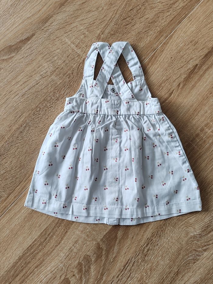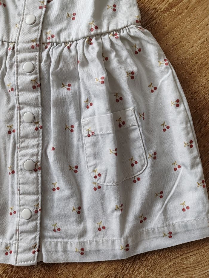 Robe blanche à motifs cerises, bretelles croisés dans le dos, petites poches devant, ouverture par boutons pressions sur tout le devant. Kiabi, taille 1 mois, très bon état.