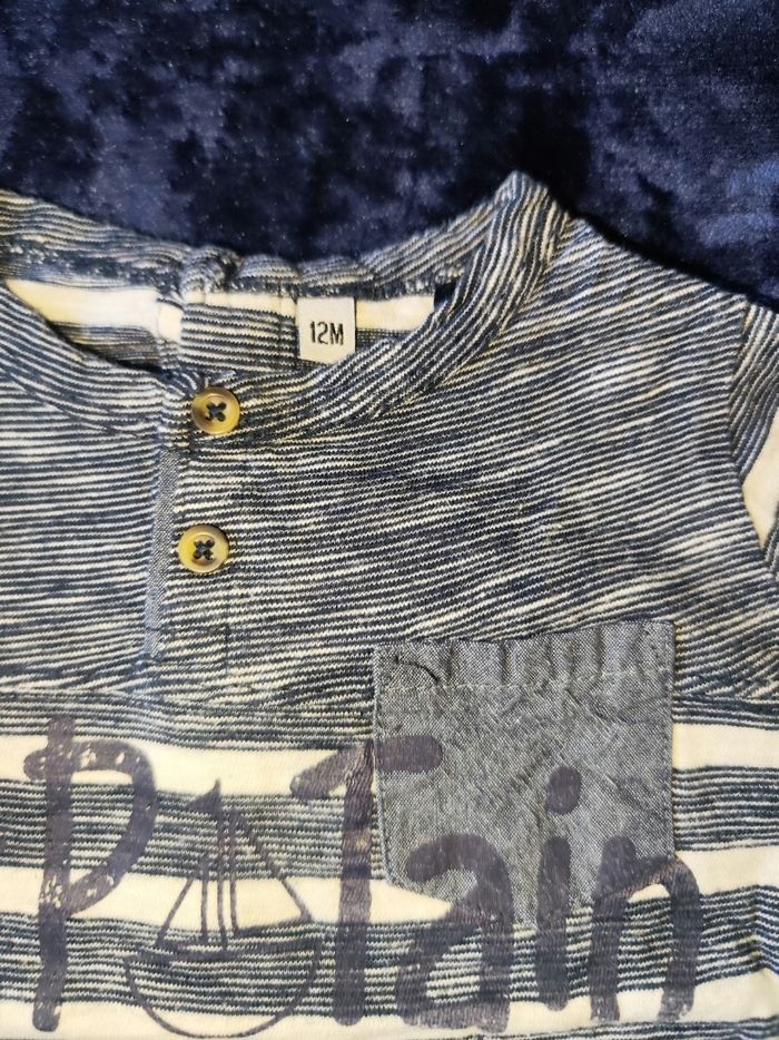 T shirt manches longues, pull fin tissaia 12 mois En très bon état Vêtement porté mais pas de trou ou autre défaut. Nos vêtements sont stockés dans des boîtes en plastique. Je peux donc les laver avant envoi si vous le souhaitez.