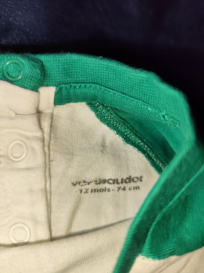 T shirt manches longues, pull fin Verbaudet 12 mois En très bon état Vêtement porté mais pas de trou ou autre défaut. Nos vêtements sont stockés dans des boîtes en plastique. Je peux donc les laver avant envoi si vous le souhaitez.