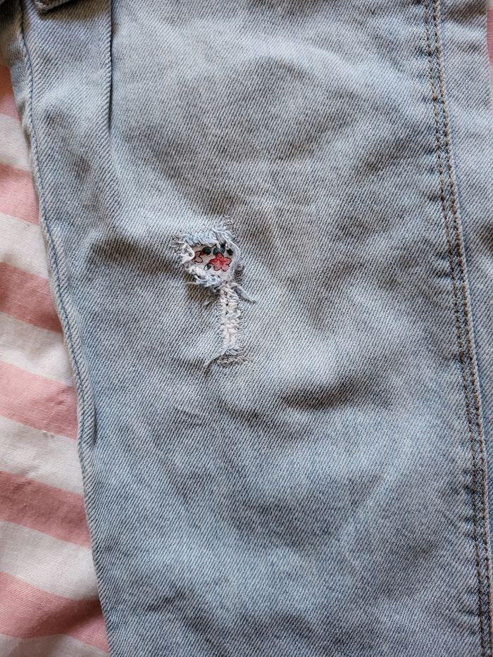 Porté plusieurs fois Réparé au genou avec un tissus fleuri qui donne un rendu sympa Taille grand mais taille ajustable