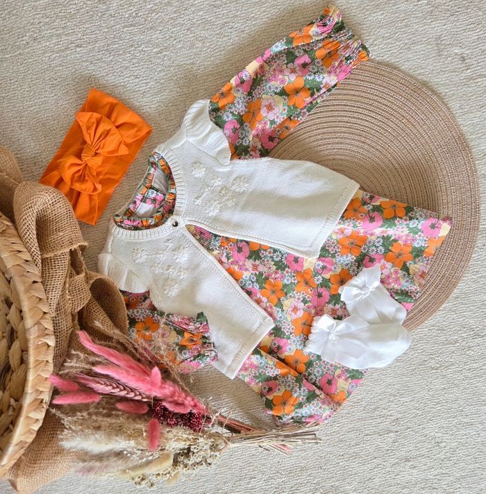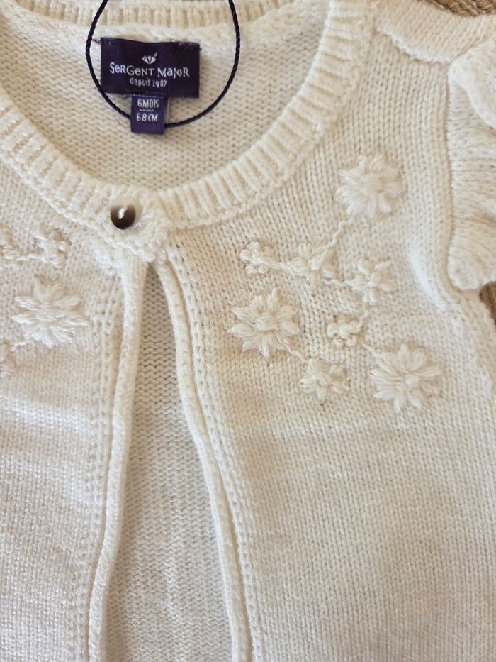 Magnifique ensemble Sergent Major en taille 6 mois. Neuf avec étiquette. Cet ensemble comprend: - une robe fleurie Sergent Major neuve avec étiquette - un cardigan sans manche motif floral Sergent Major neuf avec étiquette - une paire de chaussettes + un bandeau assortis à la robe. Style bohème/ printanier. Idéale mariage, baptême, anniversaire ou cadeau naissance.