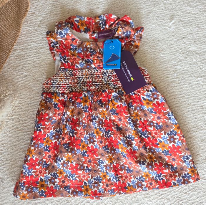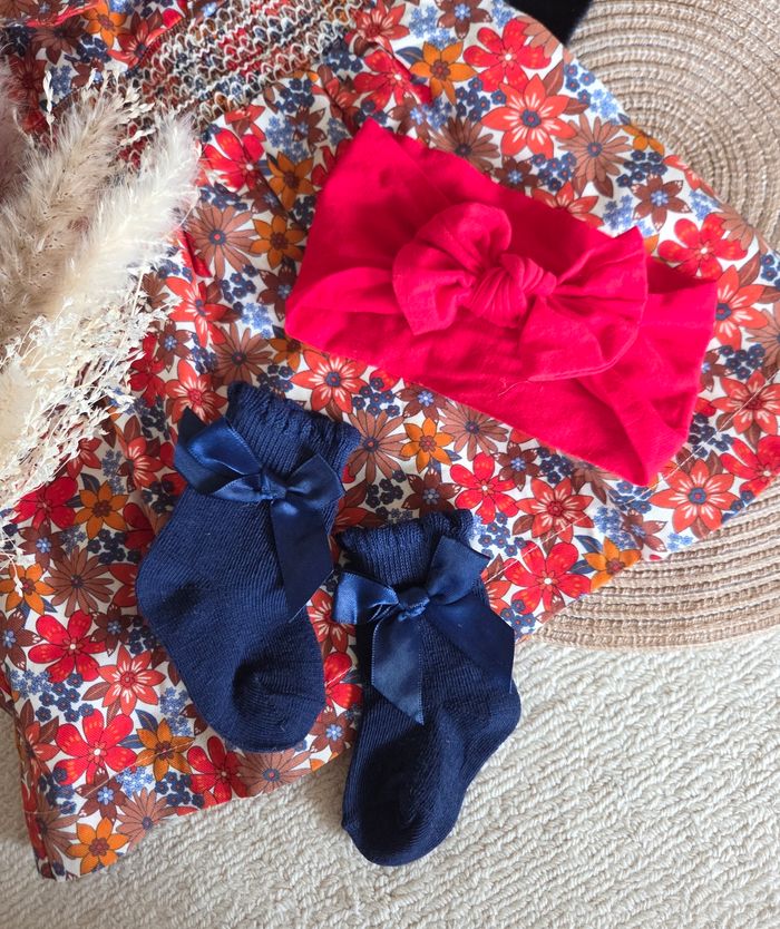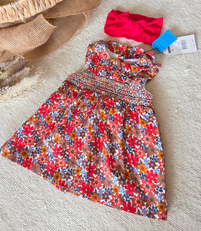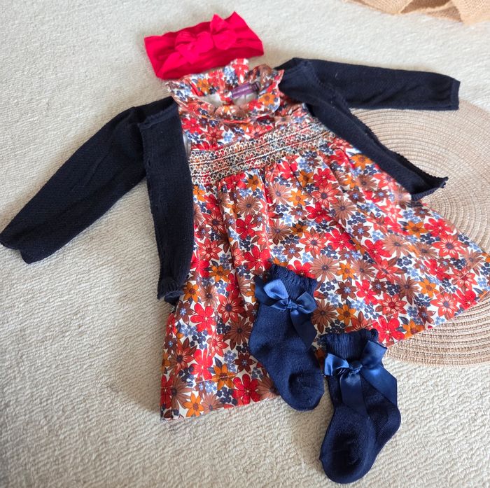 Joli ensemble en taille 6 mois composé: - d'une robe fleurie Sergent Major, neuve avec étiquette - d'un gilet assorti Kiabi neuf (jamais porté, uniquement lavé) - d'accessoires neufs assortis (bandeau + chaussettes)