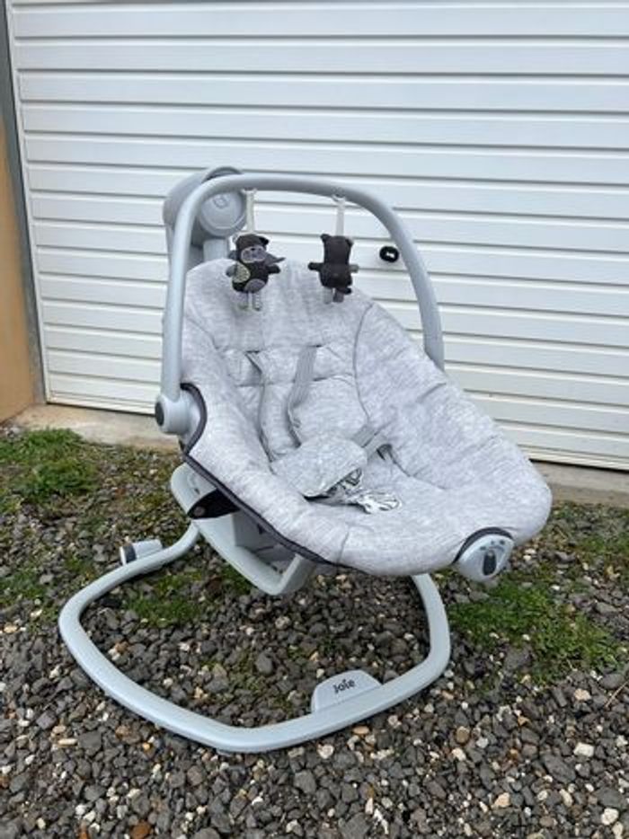 Nacelle joie Le + produit 2 modes d'utilisation : version balancelle ou version transat En version balancelle : Clipper le transat sur le support de la balancelle 2 sens de balancement, d'avant en arrière ou de gauche à droite 6 vitesses de balancement 2 vitesses de vibrations 5 berceuses classiques et 5 sons de la nature Veilleuse à la lumière douce et 4 réglages de luminosité Fonctionne sur secteur ou sur piles (4 piles LR20 non fournies) 2 roues et une poignée intégrées au cadre de la balancelle pour faciliter les déplacements Passage facile dans les portes de taille standard En version transat : Détacher le transat du support en appuyant sur un bouton gris situé sur un des côtés Insert naissance avec têtière rembourrée amovible et lavable (programme délicat) 3 inclinaisons du dossier Harnais 5 points SoftTouch avec protection au niveau de la boucle Barre de jeu intégrée à la poignée de transport réglable sur 3 positions en hauteur Déhoussable et lavable en machine Poids : 10,94 kg Poids du transat seul : 3,90 kg Utilisation: de la naissance à 9 kg Dimensions : L 91,5 x l 73 x h 81 cm