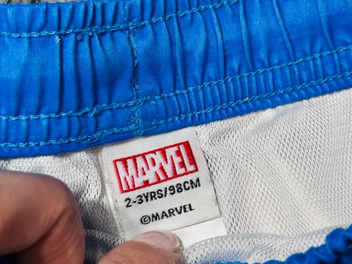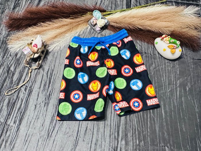 superbe short de bain aux couleurs de l'univers Marvel. On y retrouve les logos iconiques des Avengers : le bouclier de Captain America, le marteau de Thor, le poing de Hulk et le casque d'Iron Man. • État : Très bon état (porté peu de fois). • Couleur : Noir avec motifs multicolores et taille élastique bleue. • Détails : Cordon de serrage à la taille pour un ajustement parfait. Matière légère qui sèche rapidement. • Style : Parfait pour la piscine, la plage ou les fans de super-héros !