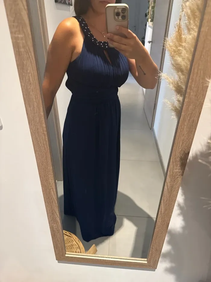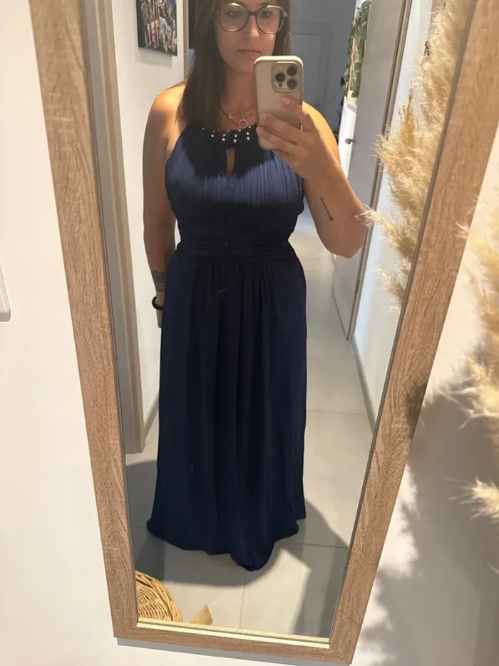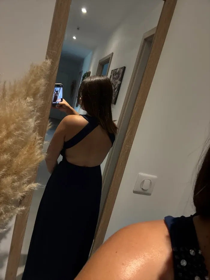 Sublime robe de soirée bleu marine en taille M, portée une seule fois pour un événement, donc en excellent état proche du neuf. Son design chic et intemporel met en valeur la silhouette tout en restant confortable. Idéale pour : Mariage 💍 Cérémonie 🎉 Cocktail 🍸 Soirée élégante ✨ Je fais 1,60m, et la robe touche au sol pied nus Achetée l’année dernière en magasin 120€