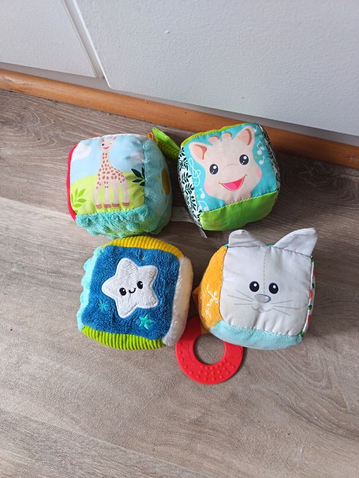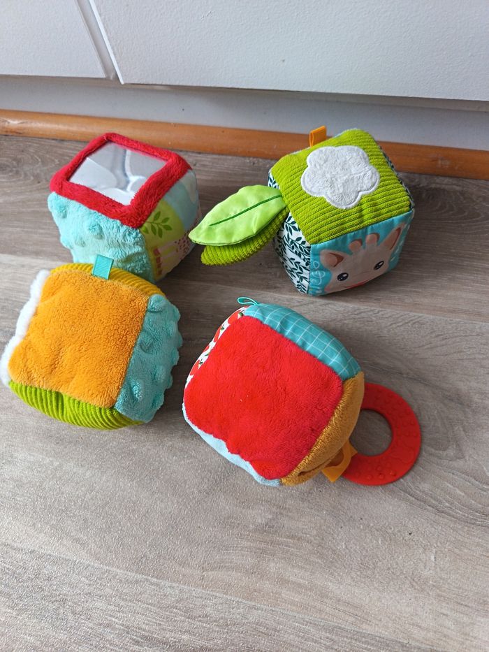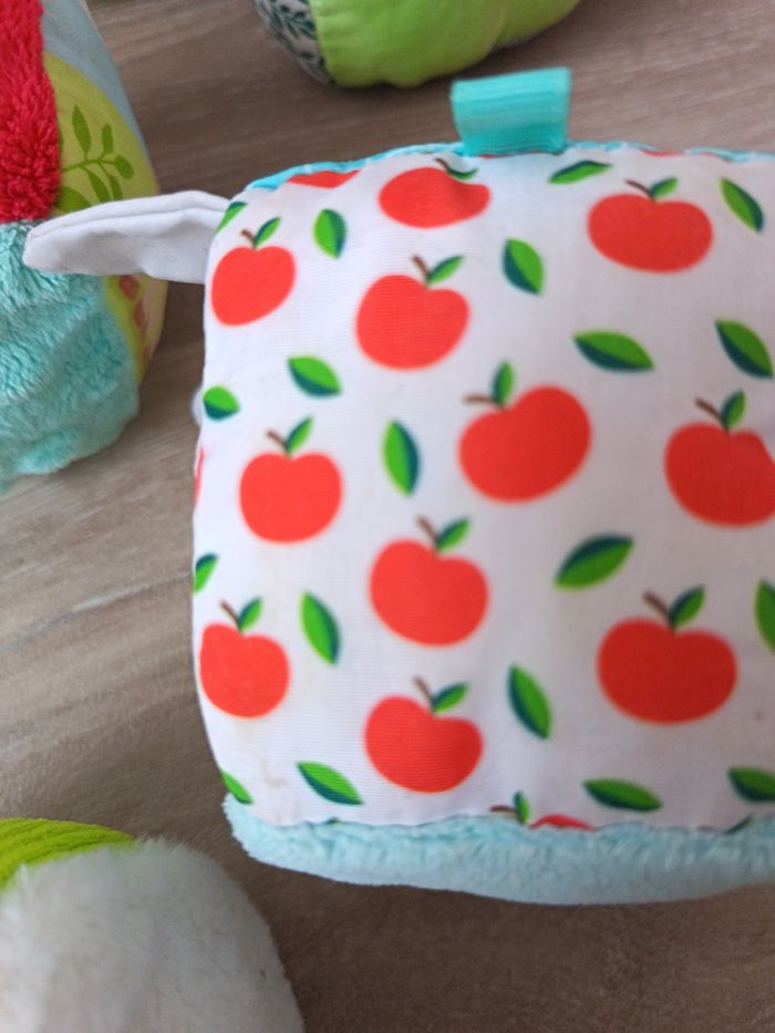 Cubes en tissus. Celui avec les feuilles à une clochette à l'intérieur Un peu tachés