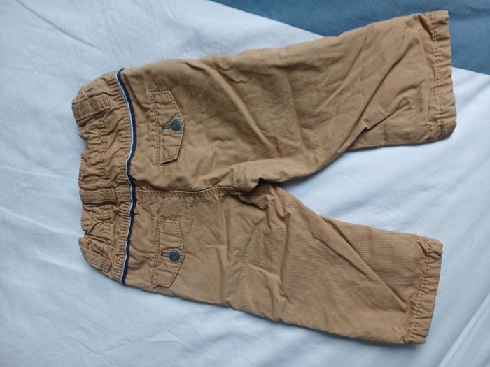 Idéal pour un bébé de 3 mois (taille 59 cm), il est à la fois confortable et élégant. Caractéristiques : Taille : 3 mois (59 cm). Couleur : Marron clair / Camel. Matière : Tissu doux et résistant (type toile ou gabardine, avec une légère texture). Parfait pour toutes les saisons. Confort : Taille élastiquée au dos pour un enfilage facile et un meilleur ajustement. Détails : Fausse braguette, deux poches à l'avant avec bouton décoratif, et deux fausses poches plaquées au dos avec rabat et bouton. Finition : Petit liseré bleu et blanc discret à la taille (devant et dos) ajoutant une touche de style. État : Porté mais en excellent état (presque neuf, pas de taches ni de trous). Genre : Mixte. Un basique de qualité indispensable dans le dressing de bébé !