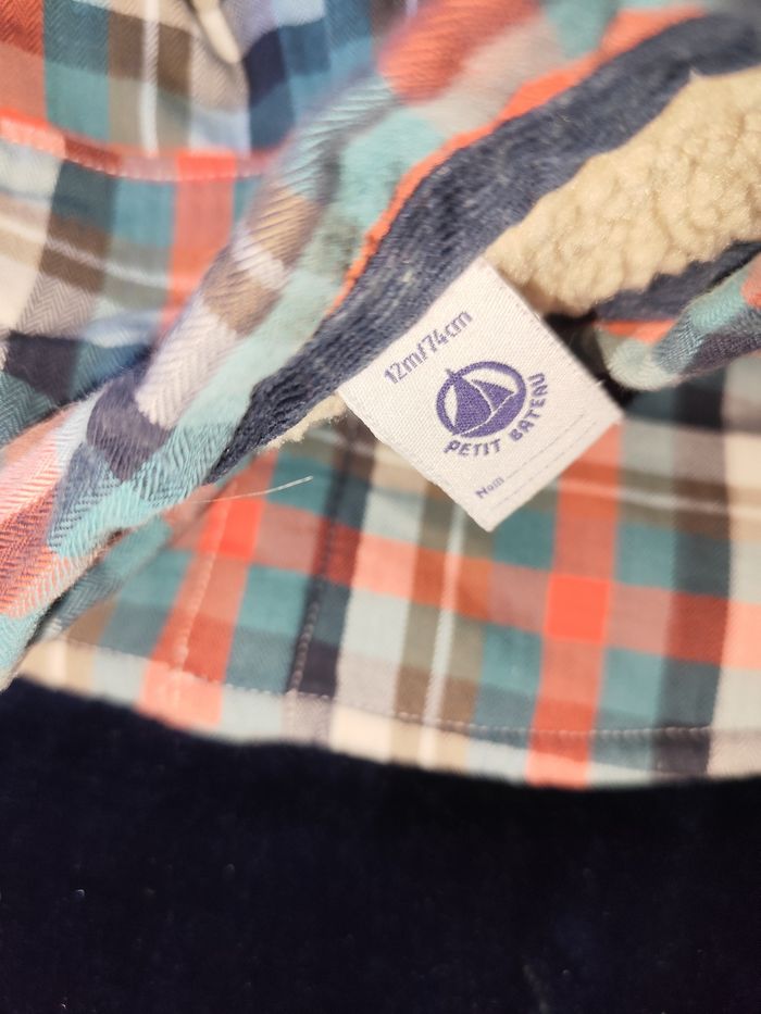 Veste molletonnée à carreaux type bûcheron petit bateau 12 mois En très bon état Vêtement porté mais pas de trou ou autre défaut. Nos vêtements sont stockés dans des boîtes en plastique. Je peux donc les laver avant envoi si vous le souhaitez.