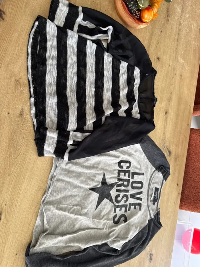 Un pull cache cache taille S marinière avec transparence noir sur les bras et épaules Un t shirt manches longues taille S le temps des cerises, en très bon état peu porté
