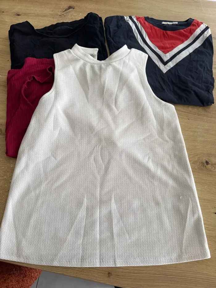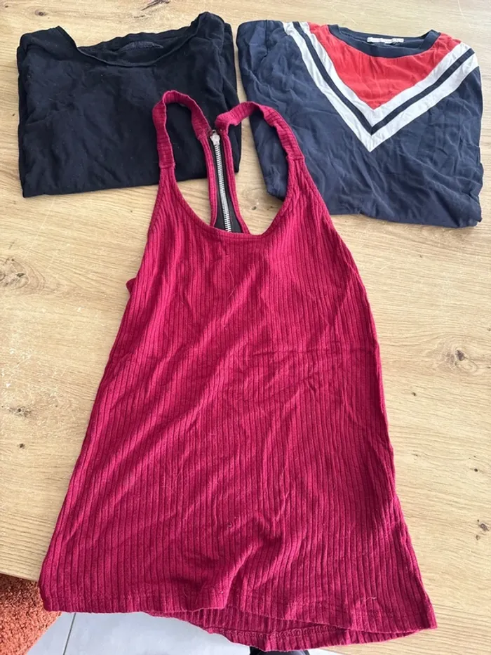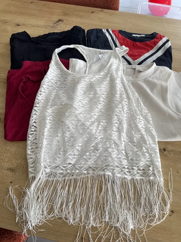 Plusieurs t shirt et débardeurs pour femme en taille S - un bleu marine avec triangle rouge - un t shirt noir basique - un débardeur bordeaux - un haut blanc habillé - un débardeur d’été avec franges blanc