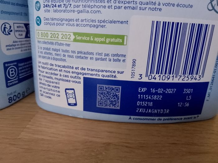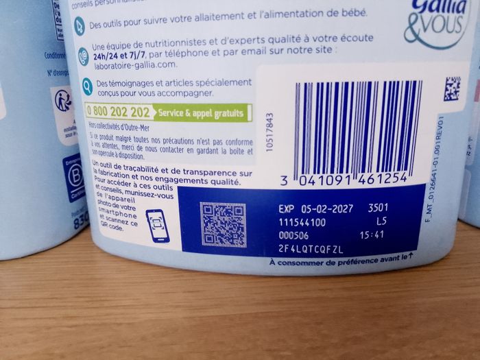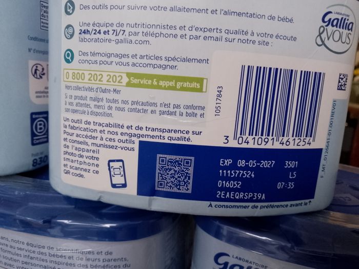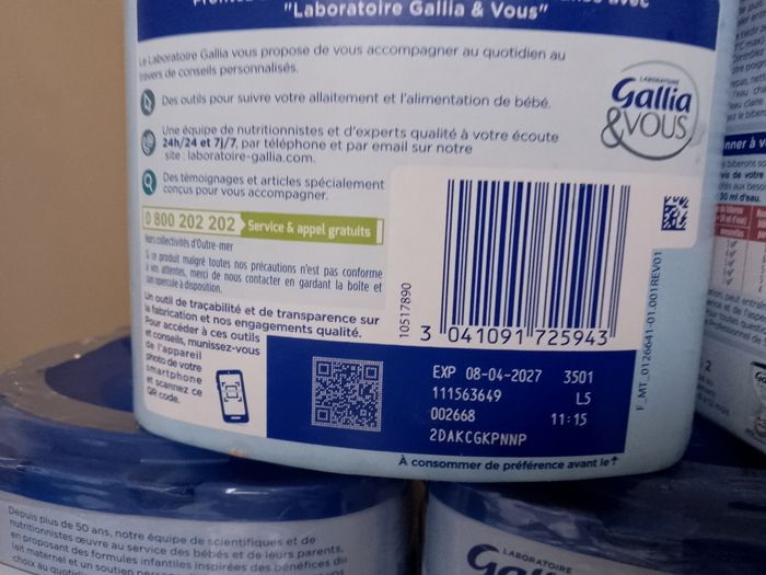 5 boîtes de lait Gallia relais 1er âge neufs encore sous scellés, expirent en 2027 et ne concernent pas les lots rappelés.