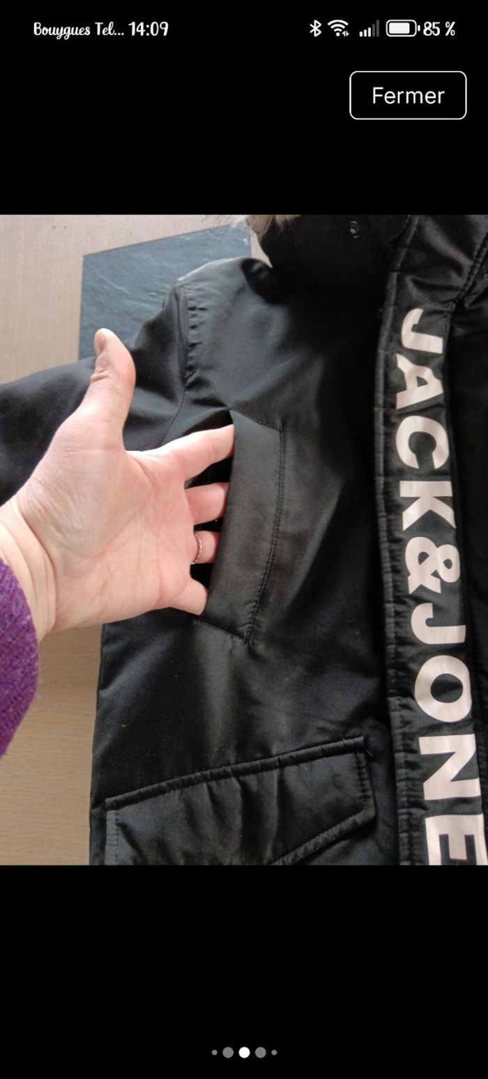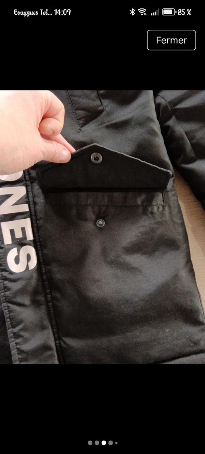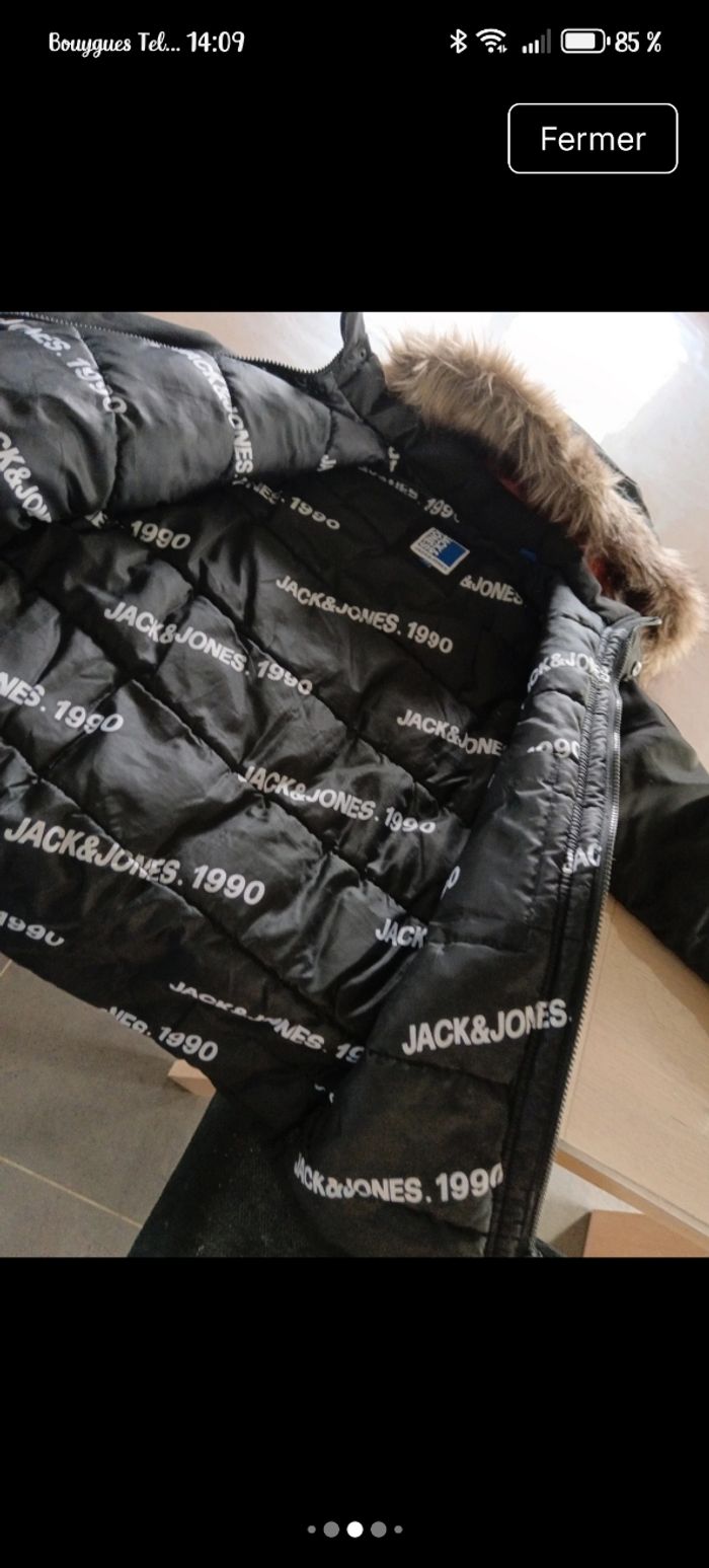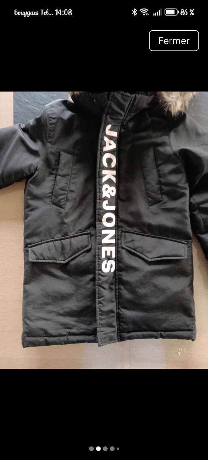 Manteau jack & jones Toutes saisons (pas très rembourré) 10 ans Fermeture éclaire et pressions Multi poches avec pressions Les Poils de la capuche sont amovibles par pressions également Et la capuche se retire par zip Égratignures peu visibles sur la dernière photo