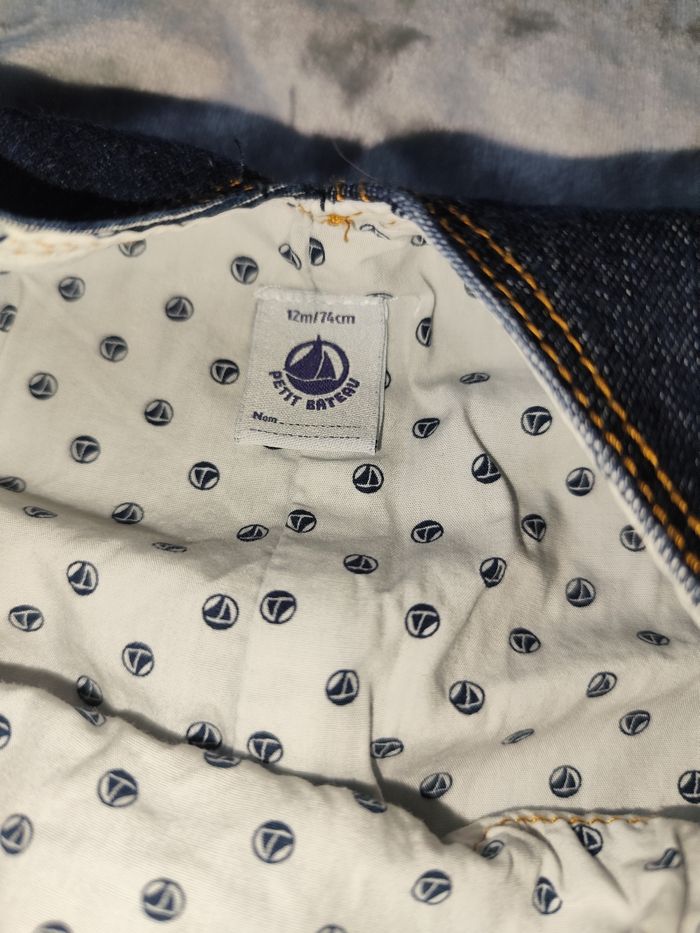Salopette jean petit bateau 12 mois En très bon état Vêtement porté mais pas de trou ou autre défaut. Nos vêtements sont stockés dans des boîtes en plastique. Je peux donc les laver avant envoi si vous le souhaitez.