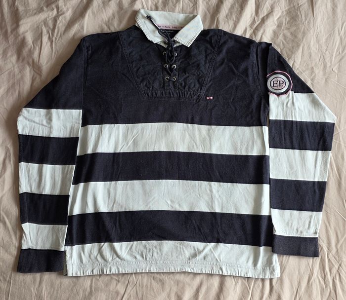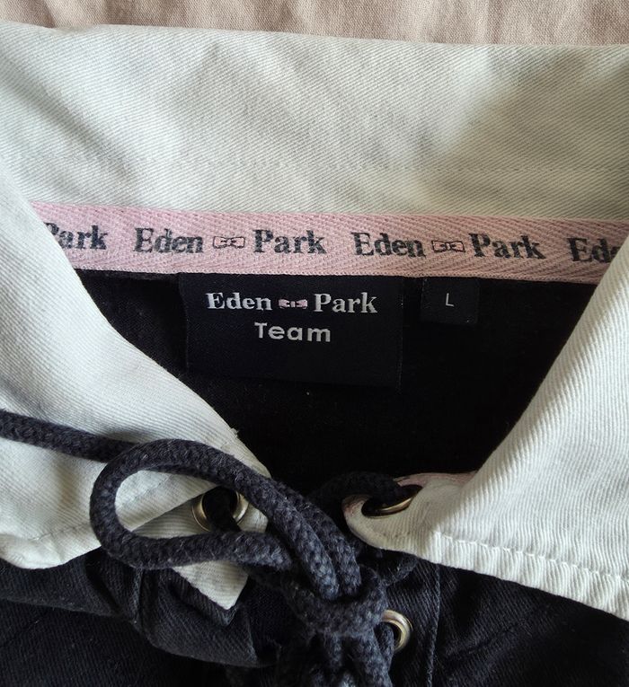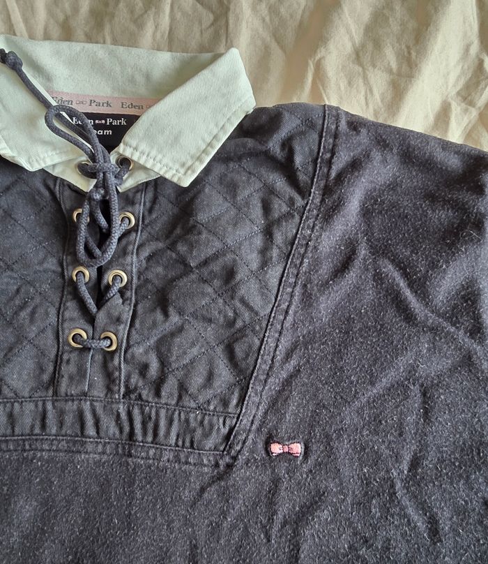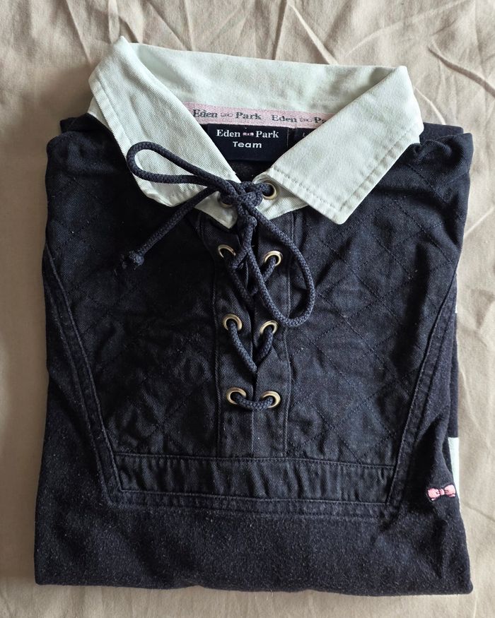 ​✨ ÉTAT : Bon état. Le tissu bouloche légèrement par endroits, mais la pièce reste de très belle qualité et les couleurs sont bien conservées. Écusson "EP" sur la manche et nœud papillon rose brodé impeccables. ​📏 TAILLE & COUPE : Taille L. Coupe rugby classique, confortable et robuste. Col blanc contrastant avec fermeture à lacets authentique et empiècement plastron matelassé à l'avant. ​🌿 MATIÈRE : 100% Coton. Maille épaisse et de grande qualité, typique du savoir-faire Eden Park. ​📦 LIVRAISON : Envoi via Mondial Relay (lockers), Shop2Shop ou Chronopost (point relais physique). ​🎁 Réductions sur les lots activées ! C'est le moment d'en profiter pour grouper vos achats.