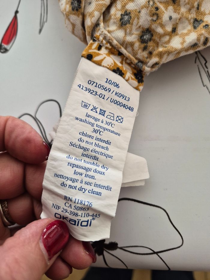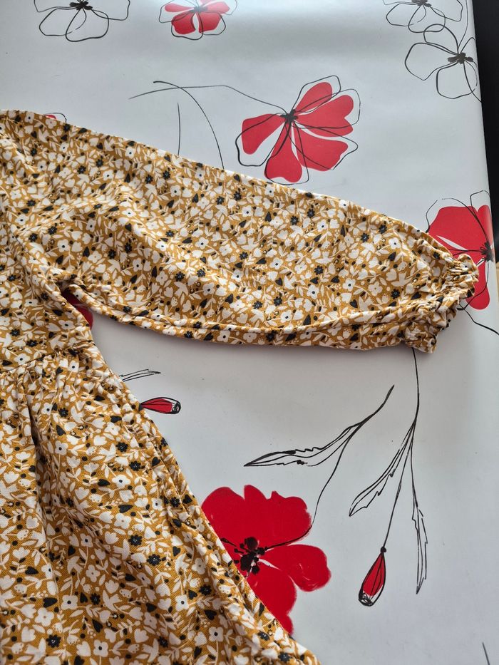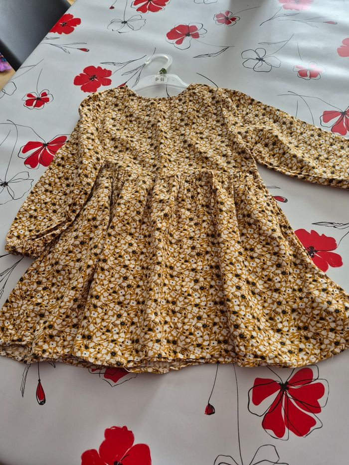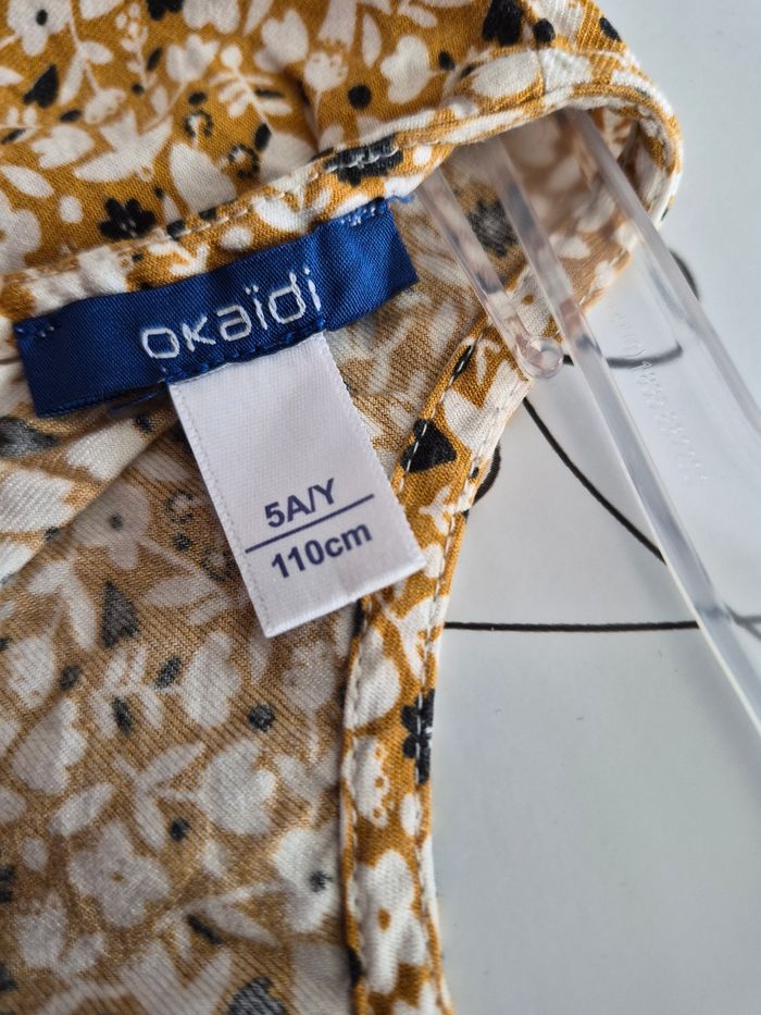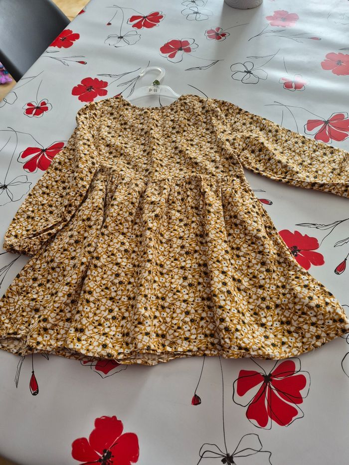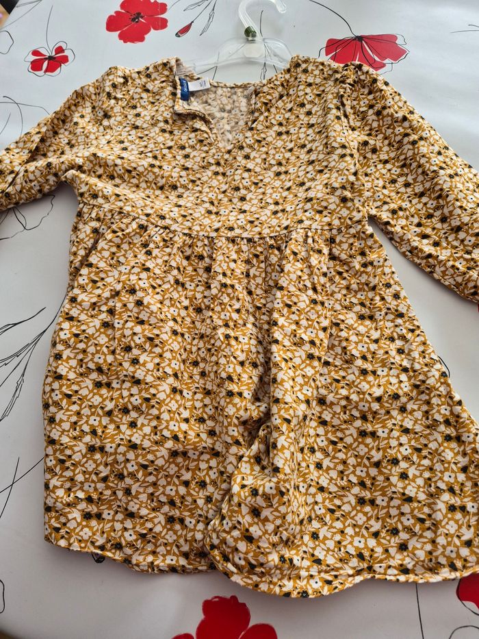 Robe manches longues , un bouton dos pour fermer Manches elastiquees, 55 % viscose et 45 % coton Taille 5 ans 110 cm Marque okaidi Couleur moutarde avec des fleurs Maison non fumeur