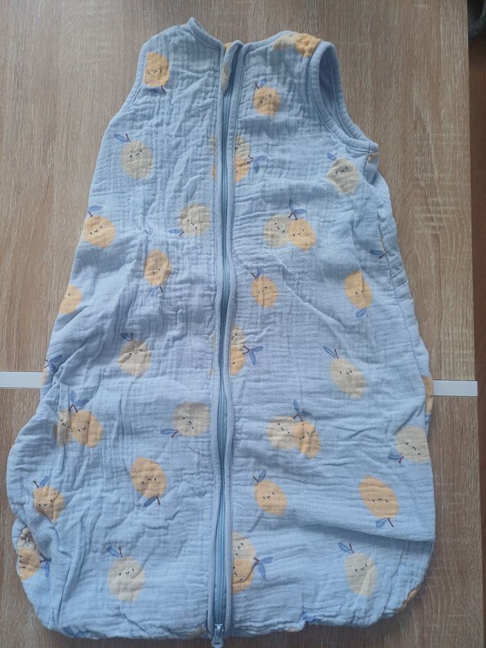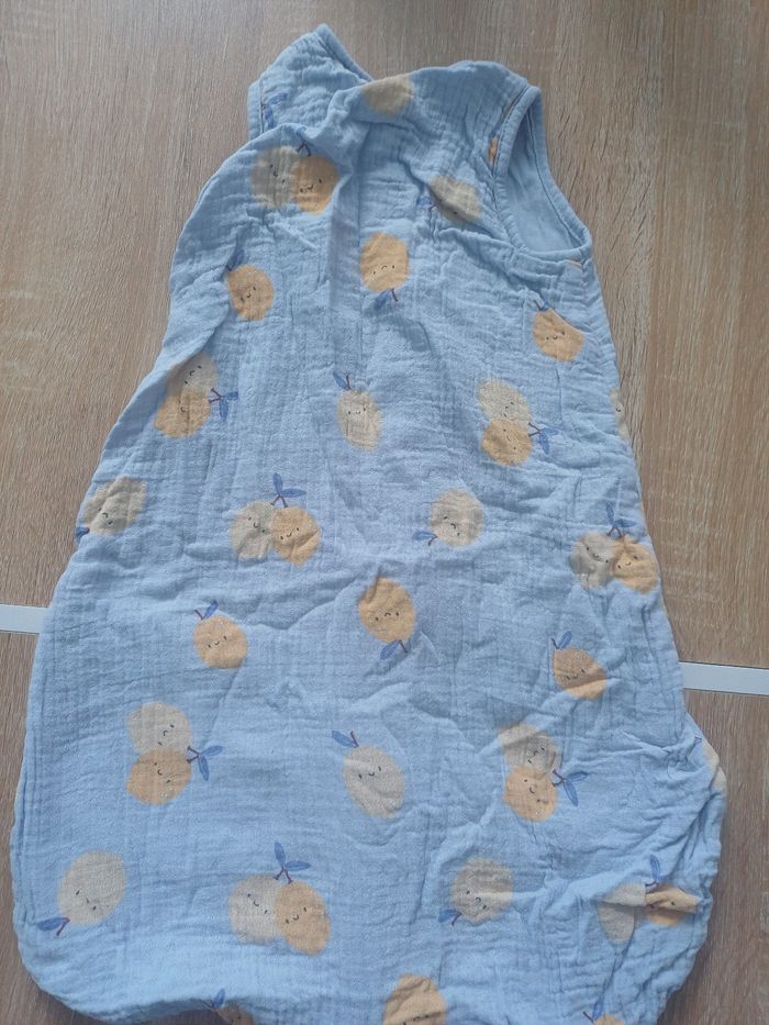 Gigoteuse légère bleue avec motif fruit TOG 0.5, taille 0-6 mois. Fermeture éclair sur le devant. Etat moyen: tâche au niveau du col Marque: Kiabi
