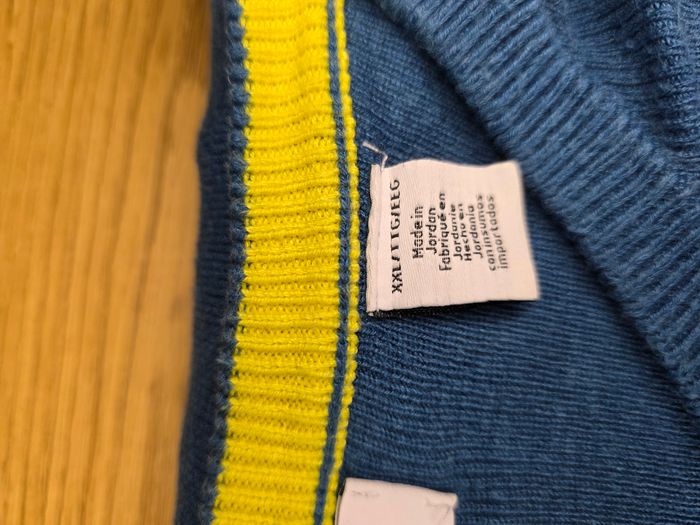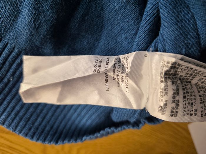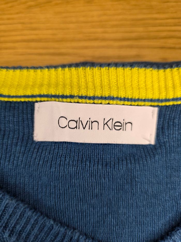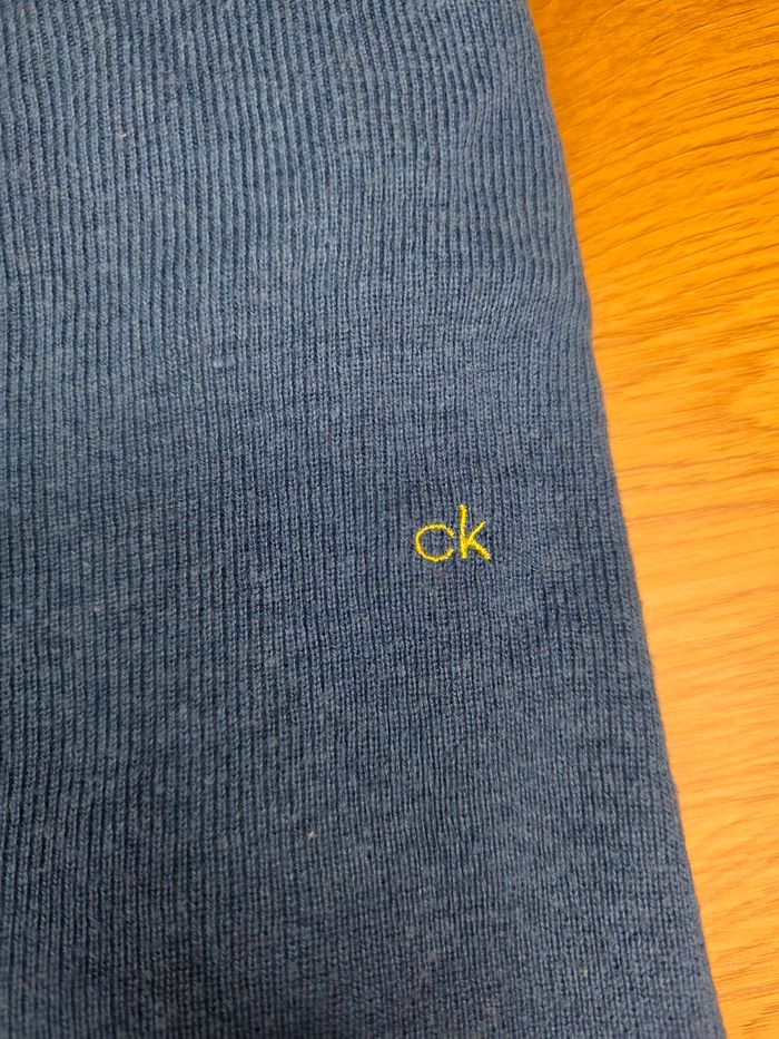 Vends pull Calvin Klein authentique en coton fin, couleur bleu chiné avec logo "ck" jaune prodé sur la poitrine. Coupe : Col en V, élégant et léger à porter. Détails : Liseré jaune contrastant à l'intérieur du col. État: Très bon état, bien entretenu déal pour un look casual chic ou à porter sur une chemise. PULL LAVÉE.