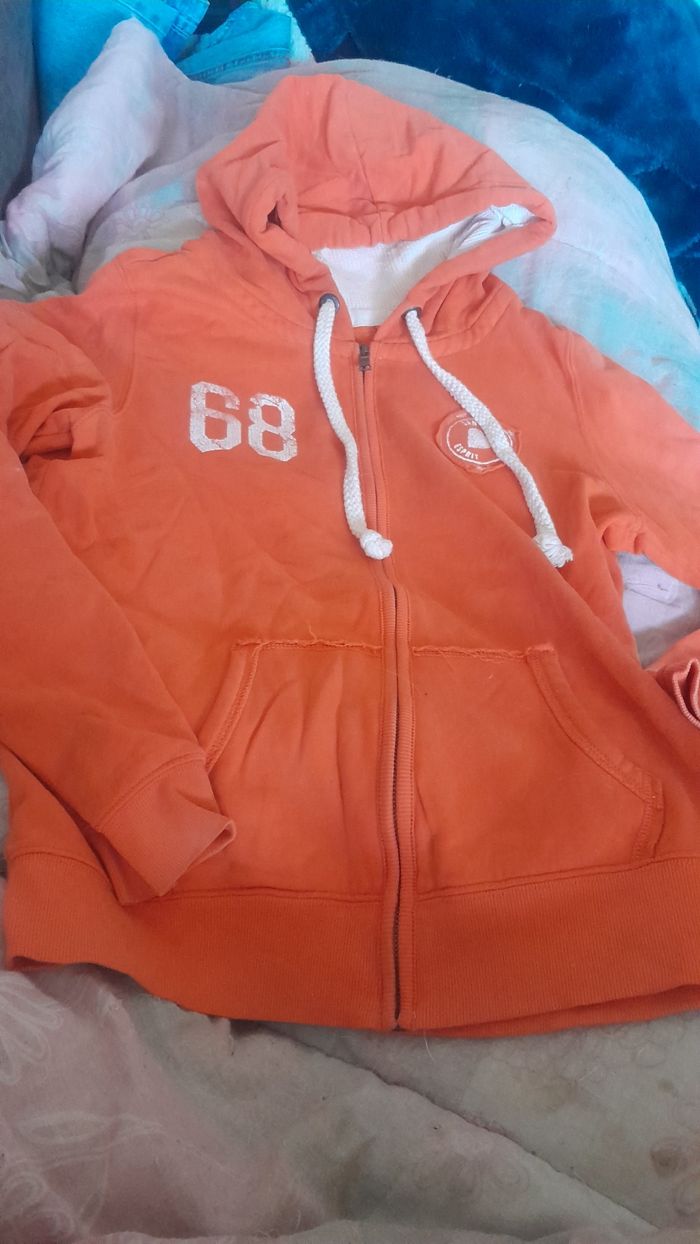 2 sweats a capuche orange. 1 pull + 1 gilet. Les 2 taillent identique, même s'ils n'affichent pas la même taille. mesures en photo. Neufs (une petite trace noire sur l'un des deux, discret, due au fait que mon fils ne les rangeait pas dans son placard, mais il n'ont jamais été portés)
