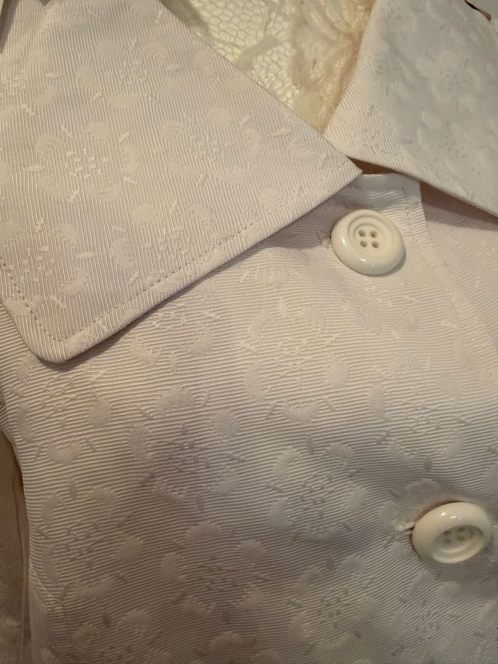 Veste longue présentant un style élégant et texturé, mélangeant des influences classiques et modernes. 📐Taille : 46 🏷️ Marque : Patrice Breal 🔒 Fermeture à bouton 🔖Neuf avec étiquette 💶 Prix boutique 60€ 🌸 Manches 3/4 larges et évasées 🌸 2 poches latérales 🌸 Motif floral ton sur ton 🌸 2 boutons de secours Dimension: 📐Aisselle à aisselle : 58 cm 📐Hauteur : 79 cm