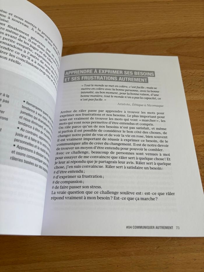 Livre en très bon état Une personne râle en moyenne 15 à 30 fois par jour...Si cela devient vite insupportable pour son entourage, c'est finalement tout aussi énervant pour soi-même: frustrant, agaçant, fatigant...Mais comment faire ? Christine Lewicki a fait le pari d'arrêter de râler pendant 21 jours consécutifs ! Elle vous propose de relever le défi et de tourner le dos à ces frustrations, ces énervements et cette fatigue que la râlerie engendre, pour retrouver sérénité, calme et plaisir de vivre !Une méthode toute simple en 4 phases, mais très efficace pour transformer son quotidien: se lancer le challenge;prendre conscience du challenge;constater les premiers bénéfices;consolider ses acquis...Avec une préface de Laurent Gounelle et des illustrations de Lili la Baleine.