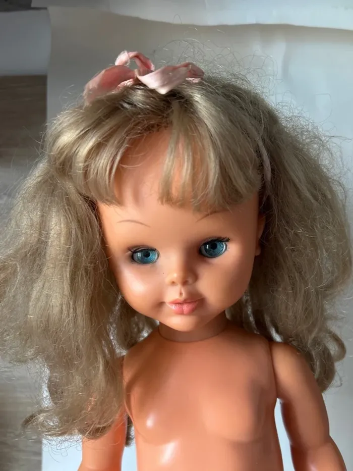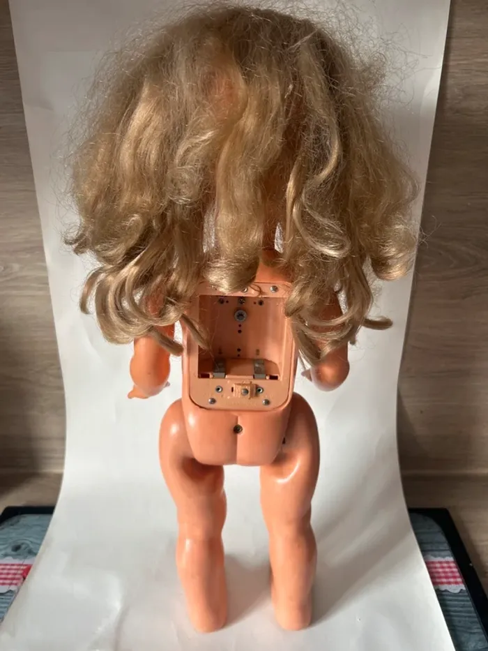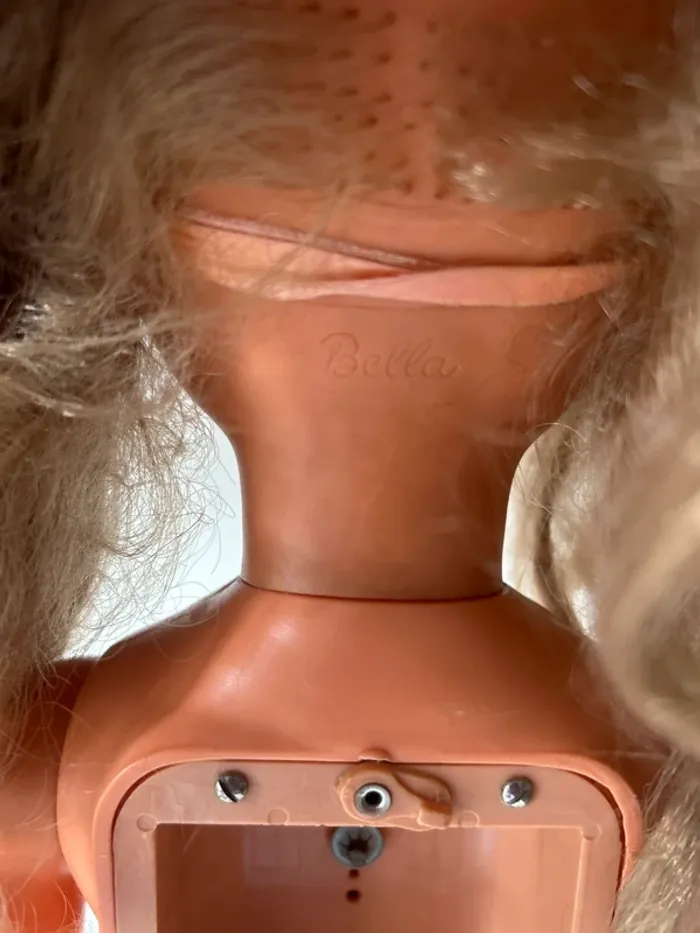 Grande poupée Bella vintage en bon état général. • Marque : Bella (inscription moulée à l’arrière du cou) • Mécanisme de marche fonctionnel • Yeux dormeurs • Cheveux longs blonds implantés • Vendue avec robe au crochet (non Bella) • Cache du boîtier piles manquant La poupée présente de légères traces d’usage normales pour son âge. Idéale pour collectionneur, décoration vintage ou relooking.