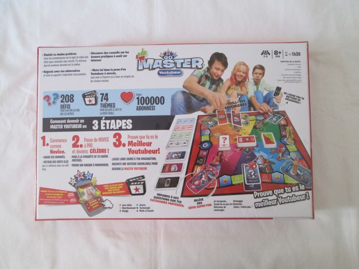 Vends jeu Go Master Youtubeur. Neuf, jamais utilisé, toujours sous blister. Dans le jeu Go Master Youtubeur, deviens Youtubeur et entre dans la course aux abonnés ! De nombreux défis t’attendent sur la route du succès et tes connaissances ainsi que ta capacité d’improvisation seront mises à l’épreuve pour prouver que TU es le meilleur Youtubeur ! Pour gagner, sois le premier à te faire suivre par 100 000 abonnés et réaliser la vidéo finale ! Un jeu qui surfe sur la tendance des réseaux sociaux et les codes des Youtubeurs et qui mêle à la fois culture générale, stratégie et fun ! Des thématiques connues de tous et très répandues sur Youtube (jeux vidéos, voyage, mode & beauté, technologie, jouet et divertissement) et un gameplay riche ! Contenu : 1 plateau de jeu, 1 dé, 6 pions Youtubeurs, 1 sablier de 30 secondes, 6 jetons de parrainage, 85 billets d'abonné, 105 cartes (défis, quiz et « j'aime/j’aime pas »), Bonus : Une application mobile gratuite déjà disponible ! N'hésitez pas à consulter mes autres annonces.