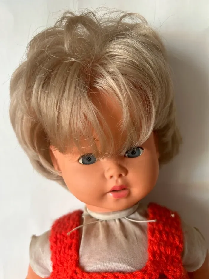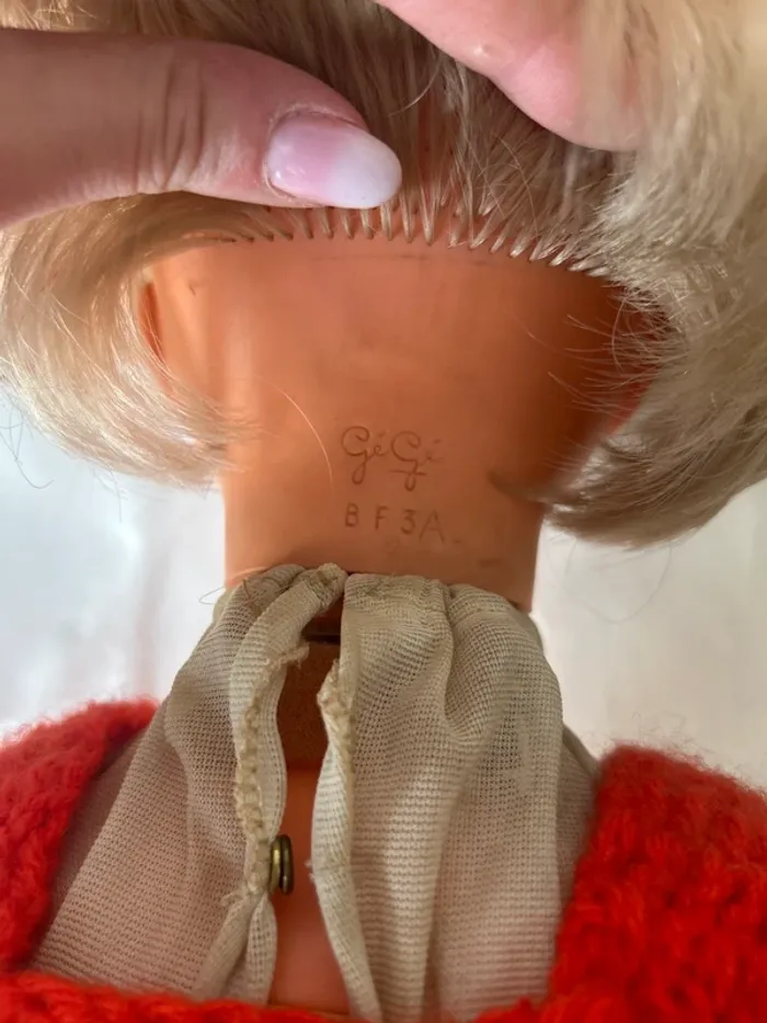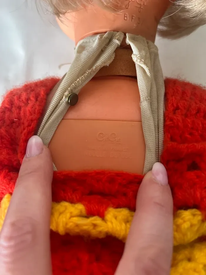 Poupon Gégé vintage en bon état général. • Marquage nuque : Gégé BF3A • Made in France • Modèle avec mécanisme à piles • Non testé • Cache piles manquant • Yeux dormeurs • Cheveux blonds implantés • Vendu avec tenue crochetée rouge et jaune Bel état esthétique, légères traces d’usage normales pour son âge. Idéal collectionneur ou décoration vintage.