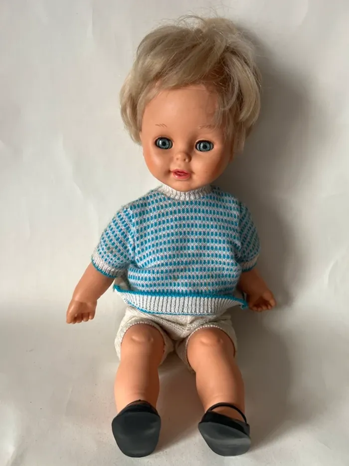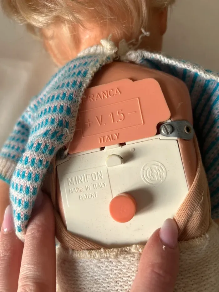 Grand poupon EFFE vintage en bon état général. • Marquage EFFE • Made in Italy • Boîtier sonore Minifon • Compartiment piles • Mini-disque présent • Non testé • Yeux dormeurs • Cheveux blonds implantés • Vendu avec tenue Bel état esthétique, légères traces d’usage normales pour son âge. Idéal pour collectionneur ou décoration vintage.