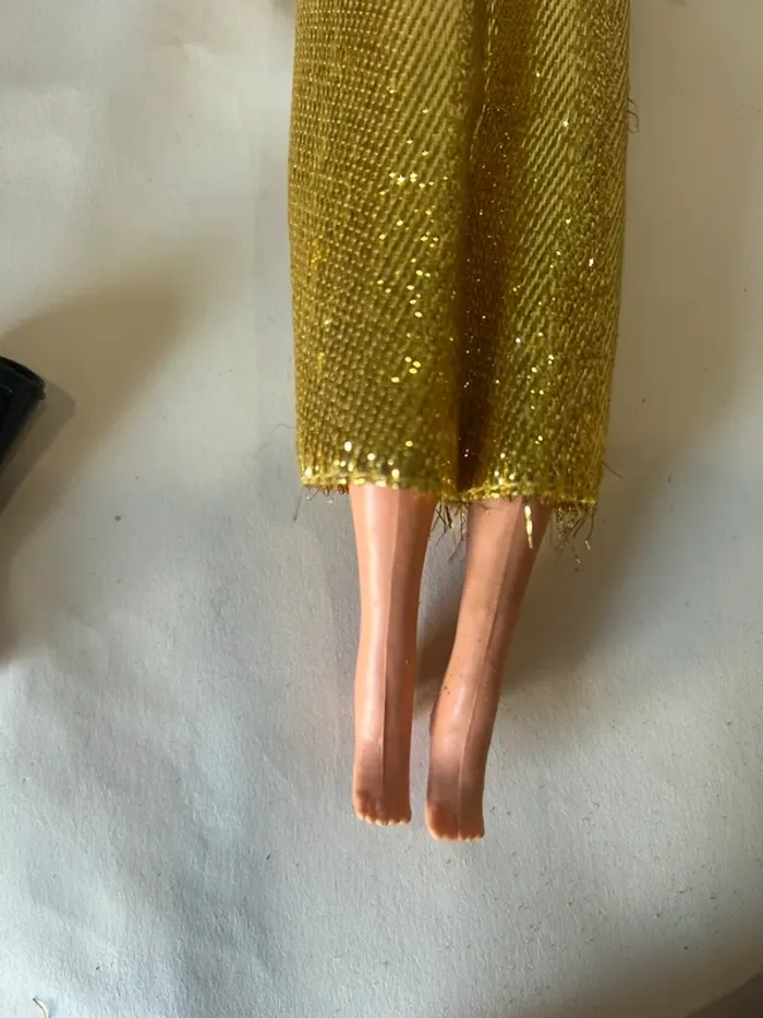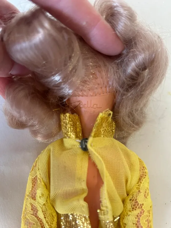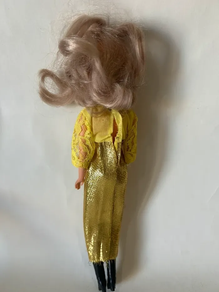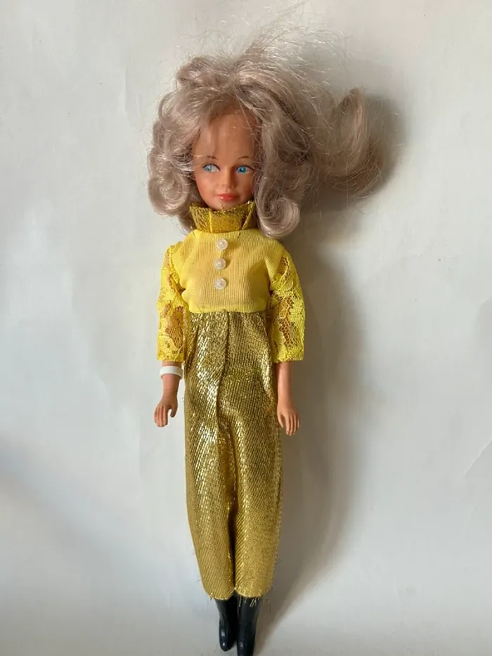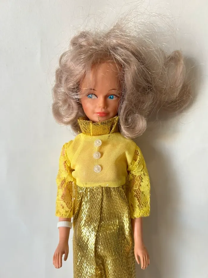 Poupée mannequin Bella vintage, modèle Tressy, référence 31.07. Modèle français des années 70 avec yeux dormeurs bleus et longs cheveux blonds. Présence du mécanisme à mèche dans le dos. Vendue avec sa tenue dorée et ses bottes noires. État correct pour son âge Objet vintage pour collectionneur ou décoration rétro.