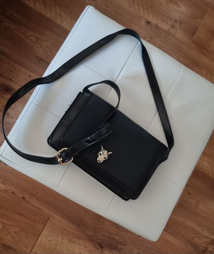Sac à main noir avec un compartiment et une petite poche intérieur qui se ferme avec 1 fermeture. Bon état