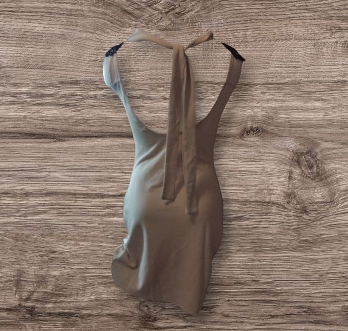 Très jolie robe ajustée de couleur beige avec détails contrastants en dentelle noire sur le décolleté. Le plus : son grand dos nu qui se ferme par un joli lien à nouer, offrant une silhouette très féminine. ​Coupe : Fourreau / moulante. ​Morphologie : La fluidité du tissu et le lien ajustable au cou permettent de bien l'adapter entre une taille 38 et 40.