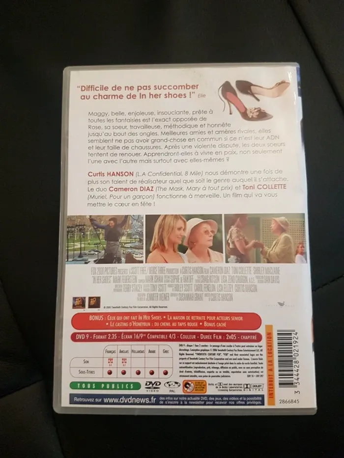 Lot 2 dvd comédies In her shoes - Boys Girls - parfait état In her shoes : Deux sœurs très différentes, l’une belle qui se croit sotte, l’autre brillante mais qui ne se trouve pas séduisante,apprennent à s’accepter et à vivre ensemble Cameron Diaz et Toni collette Boys and Girls : Ryan et Jennifer ne s'aiment pas. A 12 ans, leur première rencontre est un désastre. Ils se retrouvent à l'université. Ryan le coincé et Jennifer la désinvolte, découvrent que leurs différences les lient. Pendant quatre années, ils vont vivre une grande amitié, faite de fous rires, de pleurs et de doutes. Mais arrive ce qui devait arriver, une nuit passée ensemble et tout s'effrondre