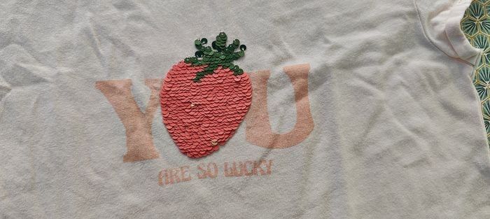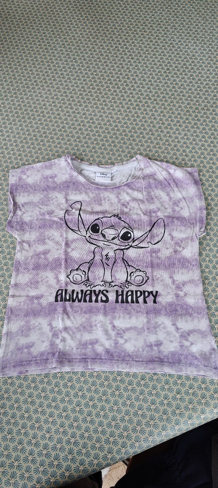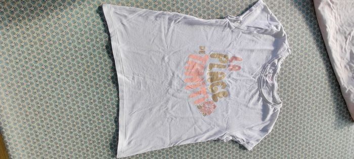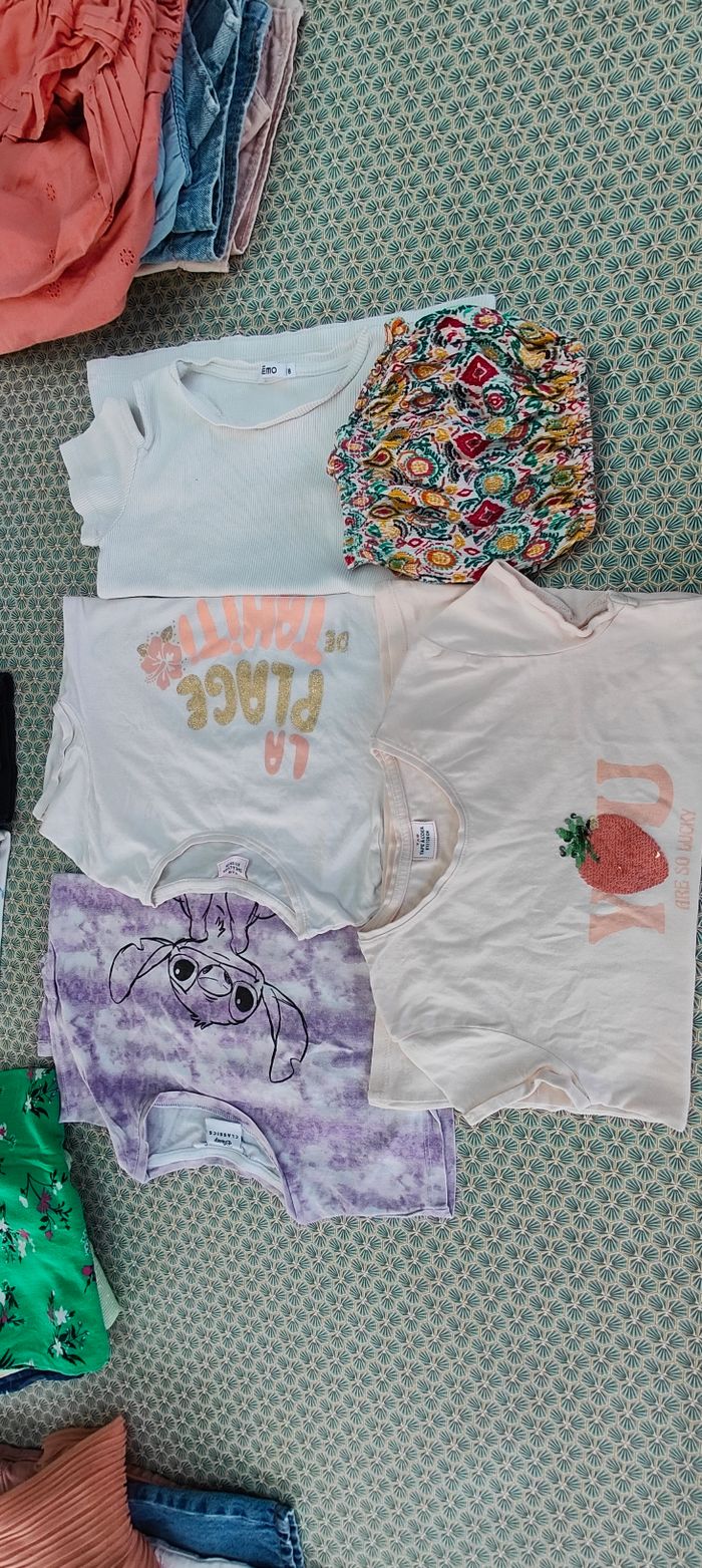 En très bon état, 1 t-shirt violet et blanc, Stitch en très bon état, kiabi 2 t-shirts rose avec des strass réversibles et rose très clair de chez tape à l'oeil, en très bon état 1 t-shirt blanc avec les épaules ajourées, de chez Gemo 1 top au couleur de l'été avec des bretelles réglables et les élastiques sont en très bon état Je peux vous fournir d'autres photos si vous avez besoin