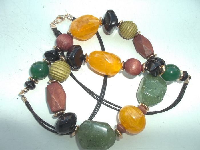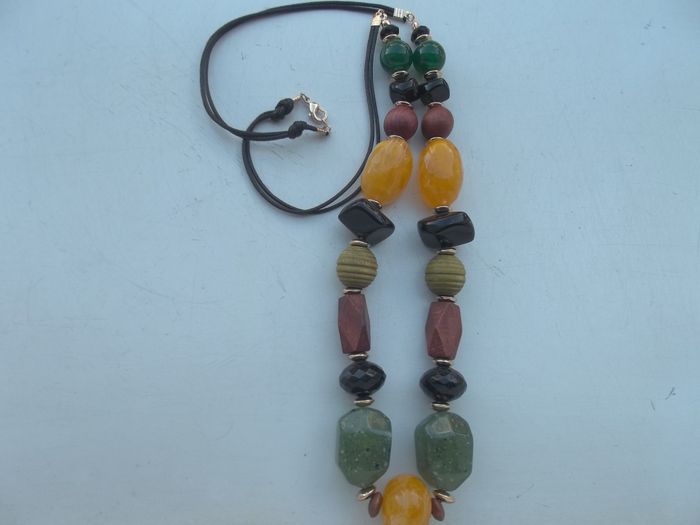 Collier sautoir en perles de résine et bois. Long 75 cm. Acheté chez besson 19€. NEUF jamais porté