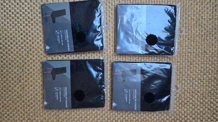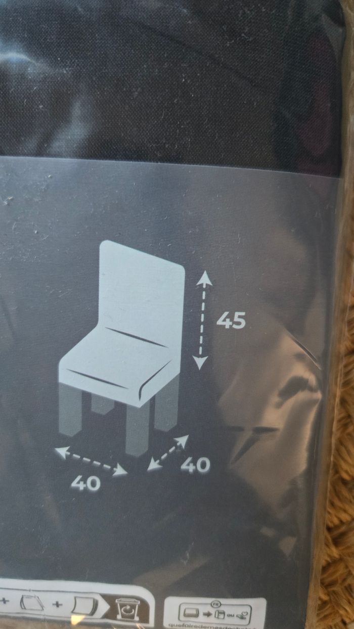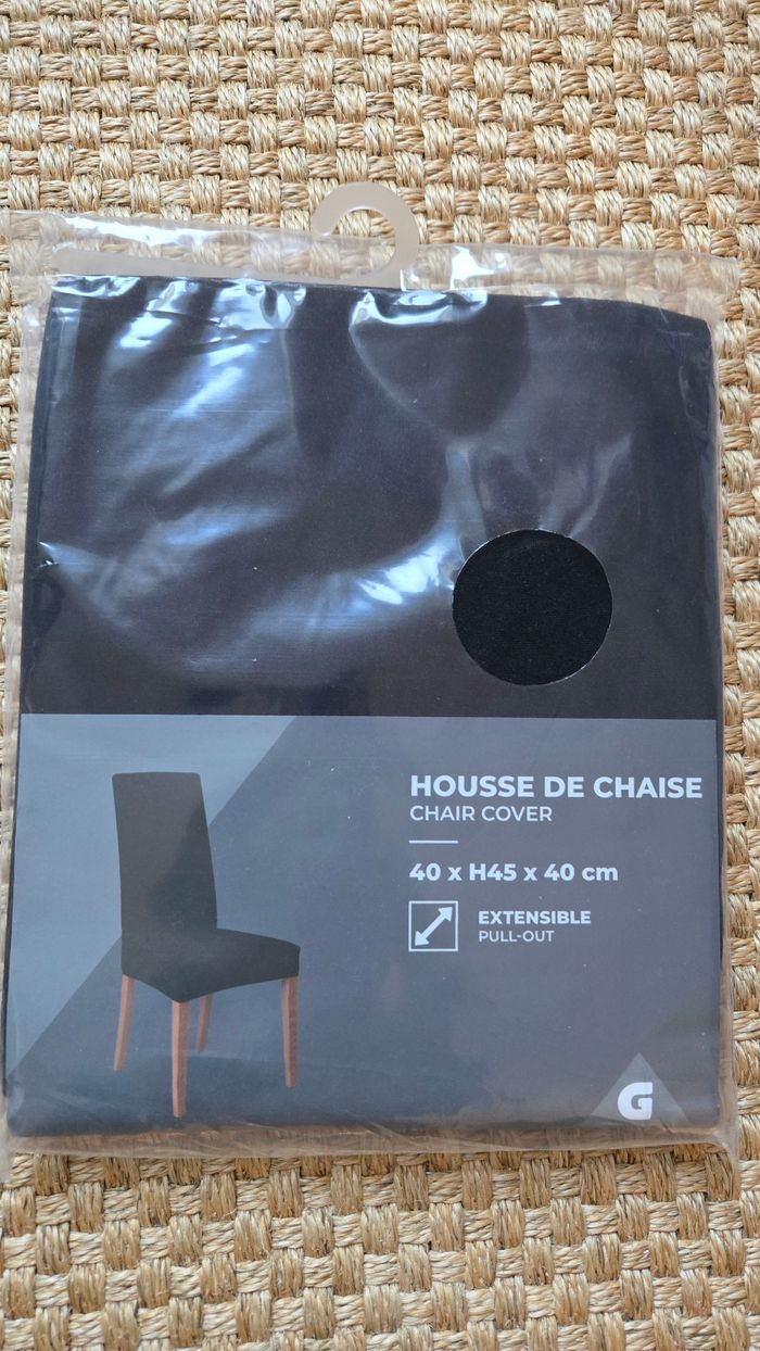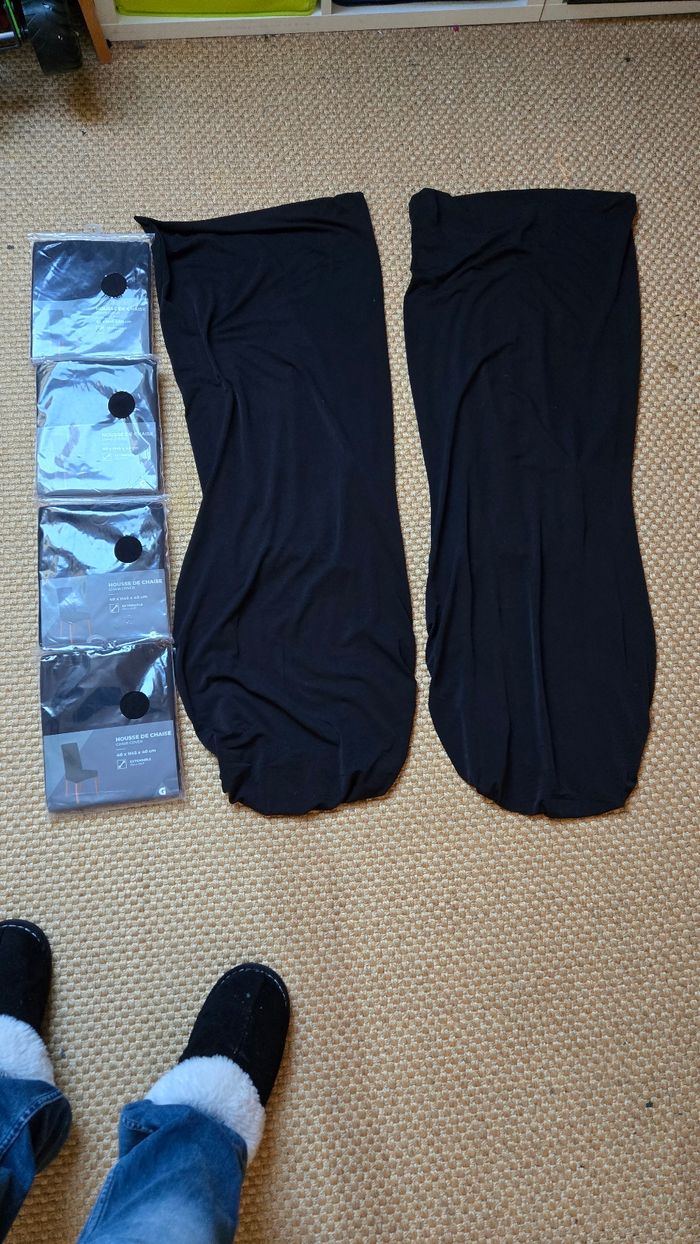 6 housses noires neuves universelles pour chaises. Permettent de redonner un coup de neuf à vos anciennes chaises. 4 encore dans leur emballage. 2 sorties pour photos.