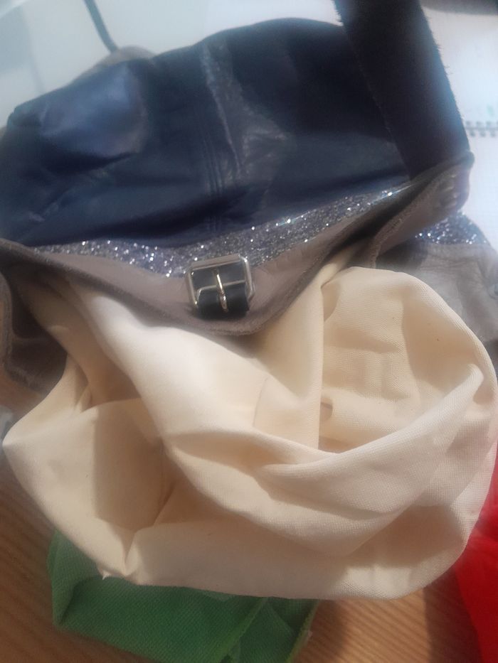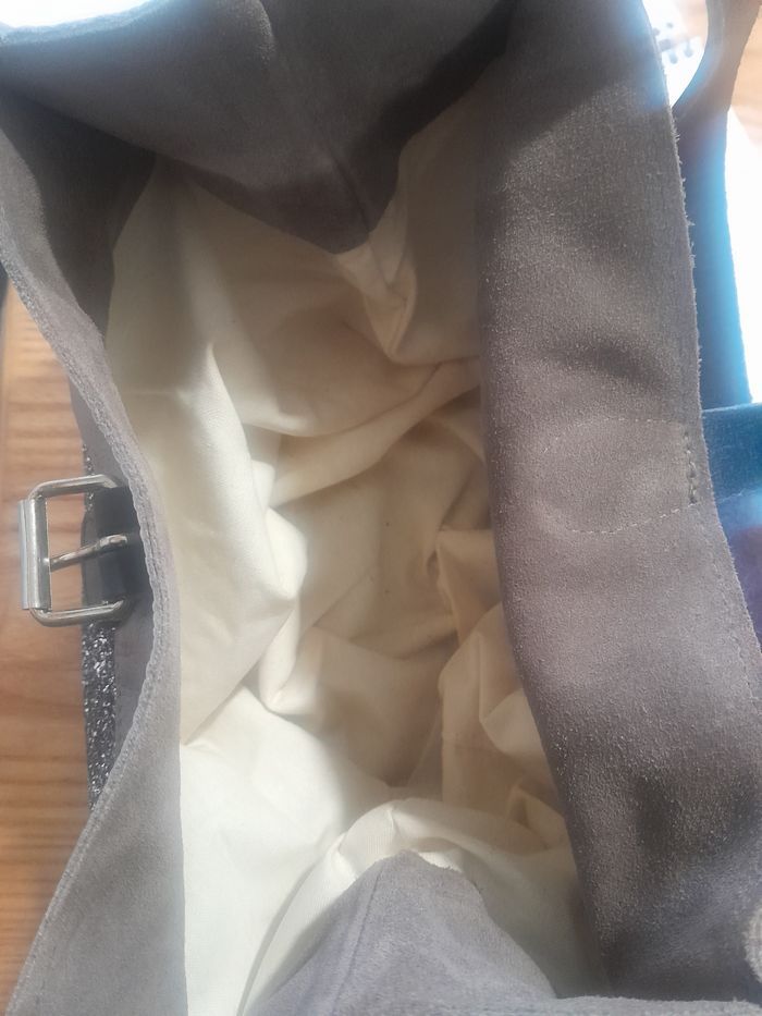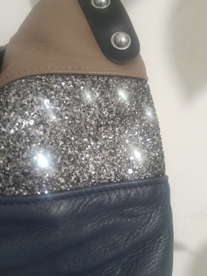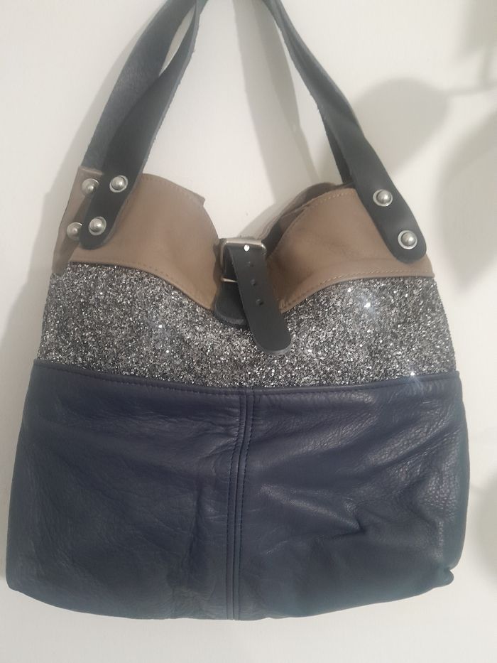 Beau sac en cuir marine en bas paillette au Centre et taupe en haut doublure en toile de coton épaisse écrue neuf fabrication française