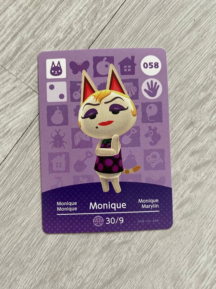 Carte Amiibo Animal Crossing officielle Monique 058. Neuve, sortie du booster et jamais utilisée. Échange possible.
