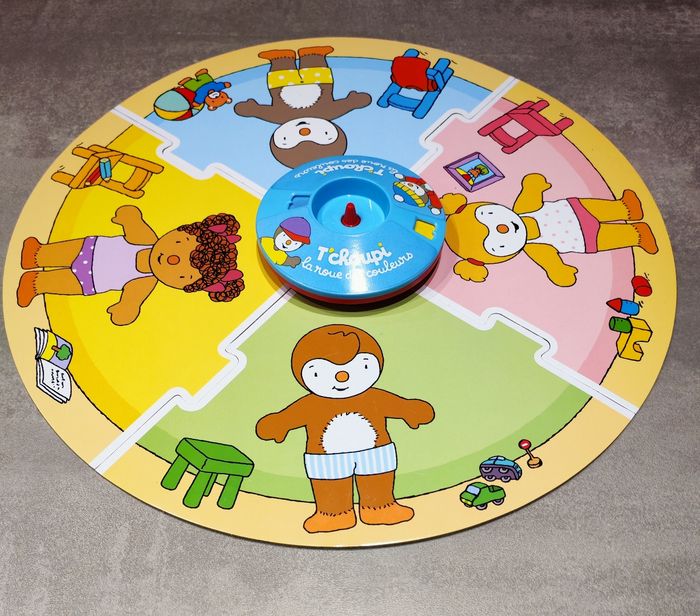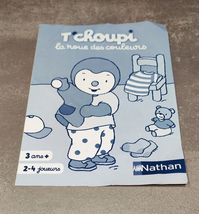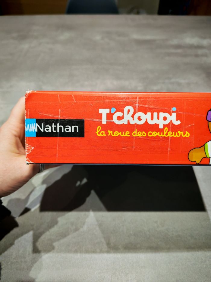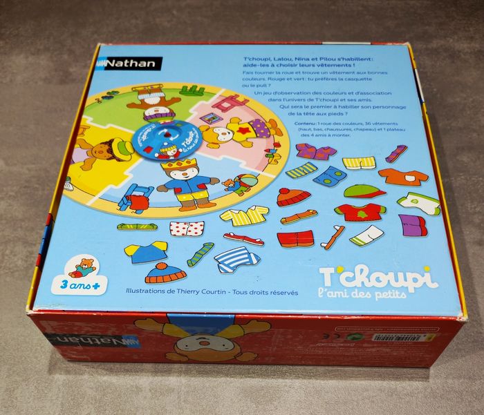 Jeu T'choupi la roue des couleurs, de chez Nathan Aide tchoupi est ses amis à s'habiller tout en apprenant les couleurs. La boîte à était abîmé et scotcher, mais le jeu est complet et en très bon état