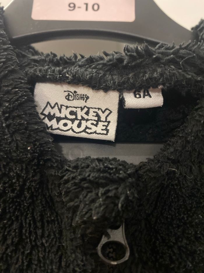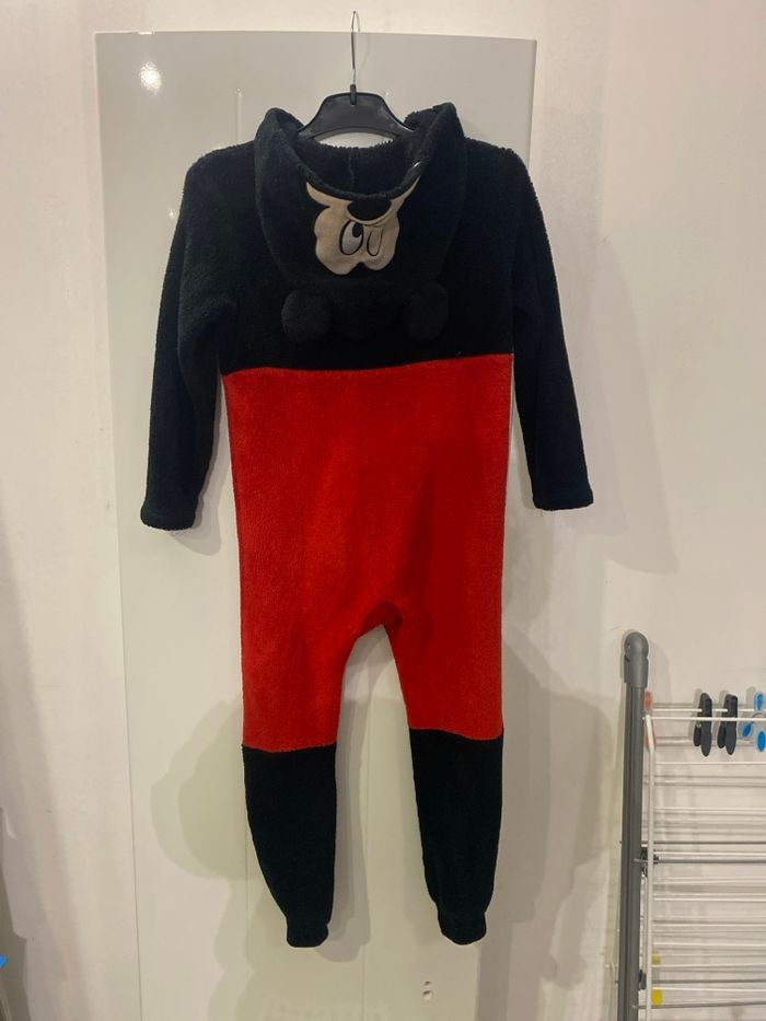 Sur pyjama, combinaison Mickey, pilou pilou Couleur noire et rouge, capuche, tête de Mickey avec oreille De l’épaule au bas du pantalon, 97cm De la nuque à l’entrejambe, 53 cm Le tissu Bouloche au niveau des chevilles