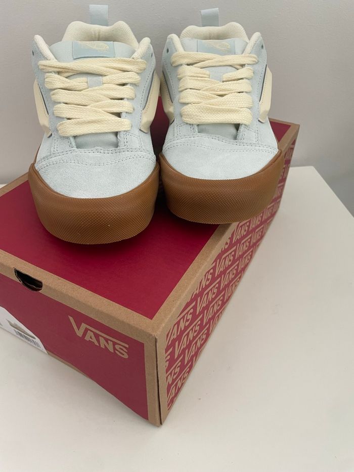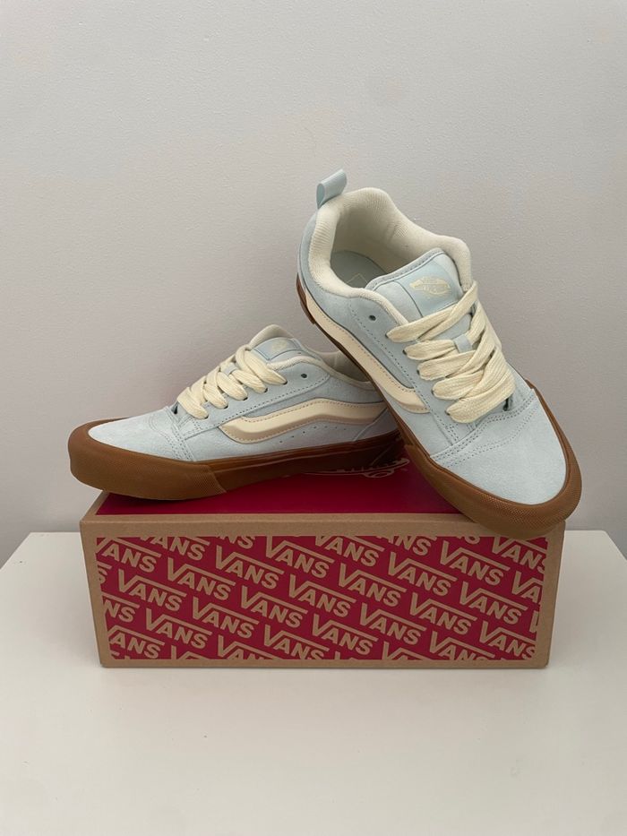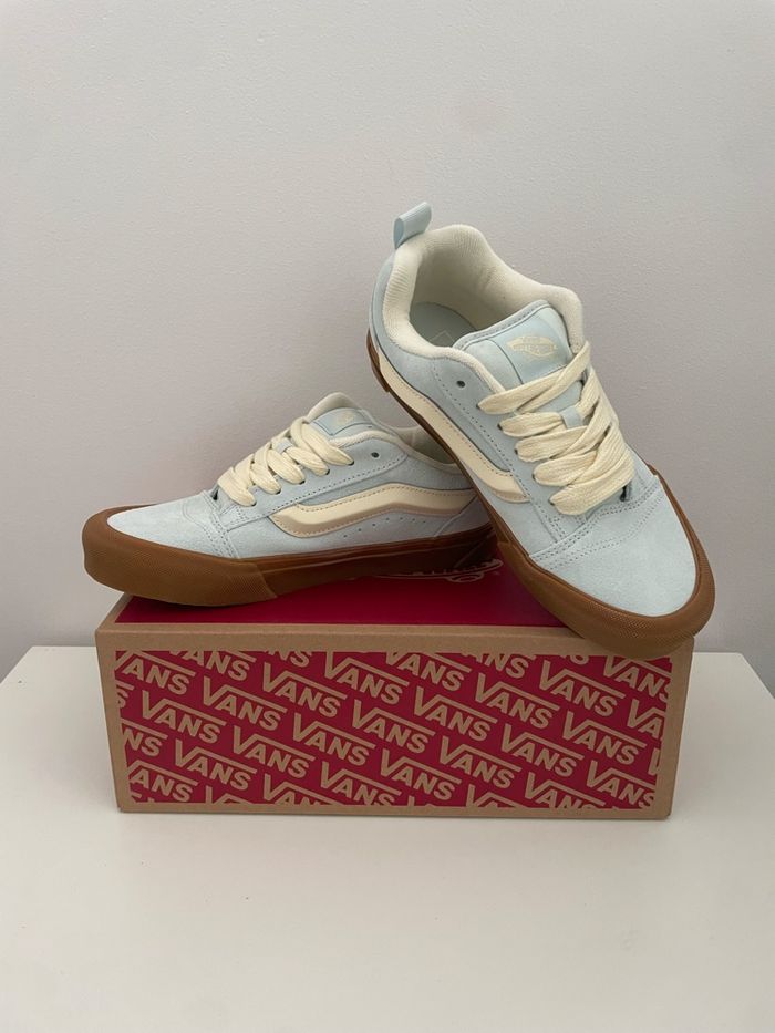 Paire de Vans Knu Skool en taille 37, coloris bleu clair avec semelle gomme et lacets crème. Modèle tendance, inspiré du style skate Y2K, très confortable et facile à assortir. • Etat : Neuf / jamais porté (voir photos) • Marque : Vans • Modèle : Knu Skool • Taille : 37 • Couleur : Bleu clair, semelle marron • Boîte d'origine : Oui