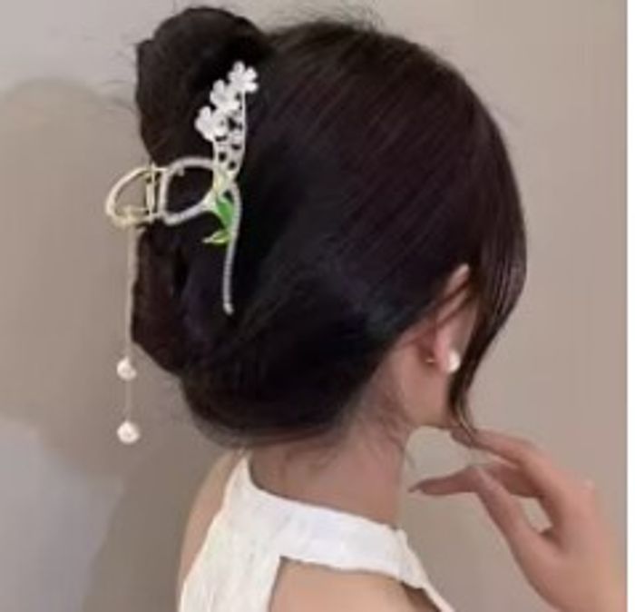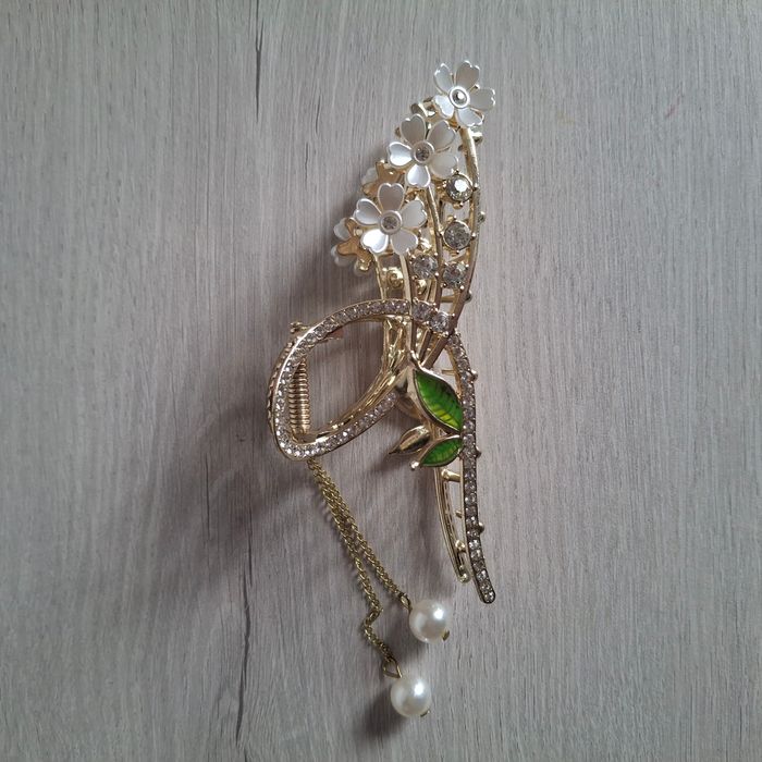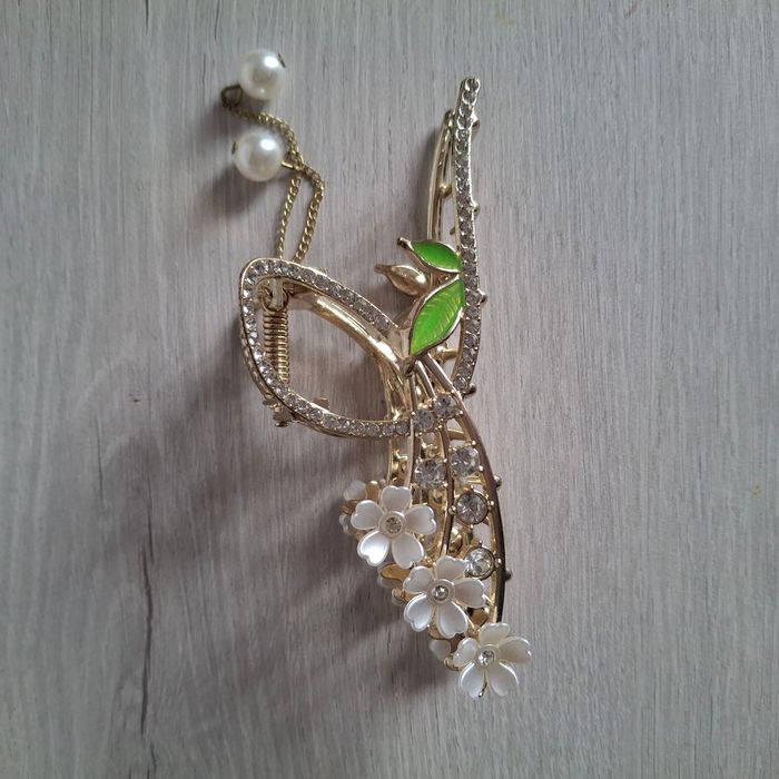 ✨Élégante pince à cheveux dorée ornée de fleurs blanches, strass brillants et perles pendantes. ✔️ Couleur : doré avec finitions vertes et blanches ✔️ État : très bon état 🚚 Envoi rapide et soigné. 🛒 Réduction si achat en lot (3 articles - 10% )