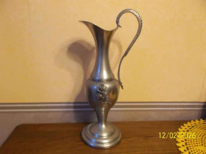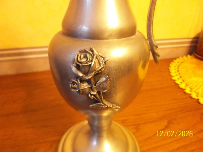 GRANDE AIGUILLERE EN ETAIN. Hauteur 33 cm. Rose sculptée. Petit choc a la base . Très bon état. Les étains de la rose. 95% étain.