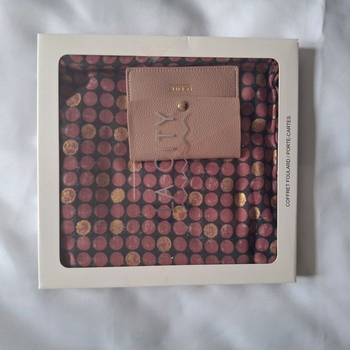 🎁 Coffret élégant : foulard aux imprimés colorés à pois + porte-carte rose ✨ Contenu : 1 foulard + 1 porte-carte ✅ Article 100 % authentique ✔️ Couleurs : foulard multicolore (rose foncé presque violet, rose clair, doré et noir) + porte-monnaie rose antique ✔️ État : Neuf, présenté dans son coffret d'origine ✔️ Taille : Unique ✔️ Dimensions coffret : 25,5 x 25,5 cm ✔️ Dimensions foulard : 91 x 186 cm ✔️ Dimensions porte-carte: 11.3 x 9 cm ✔️ Marque : La City 🚚 Envoi rapide et soigné. 🛒 Réduction si achat en lot (3 articles - 10% )