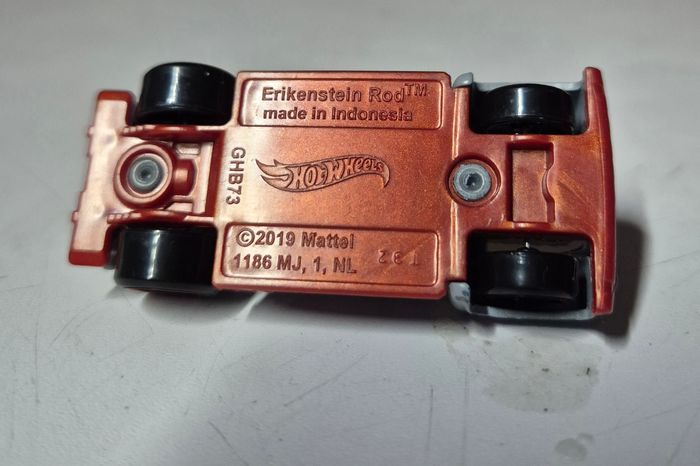 Modèle réduit Hot Wheels Erikenstein Rod, carrosserie grise avec détails rouges, moteur apparent chromé et vitrages rouges. Décorations latérales 4X, MWG Han Fabrication et Erikenstein Rod. Châssis estampillé Hot Wheels Erikenstein Rod GHB73, fabrication Indonésie. Roues noires cerclées rouge. Etat conforme aux photos #hotwheels #erikensteinrod #voitureminiature #diecast #hotwheelscollector #modelereduit #customcar #hotrod #miniature